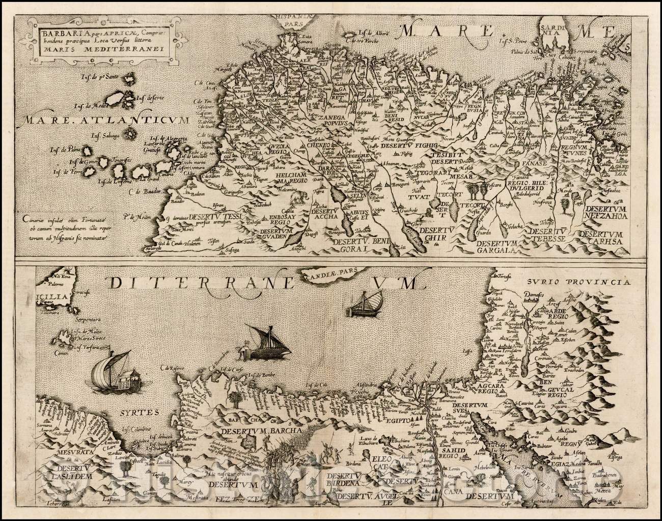 • .Historic Map - Barbaria pars Africae, Comprae: hendens praecipua Loca versus littoria Mar, 1593 - Vintage Wall Art
