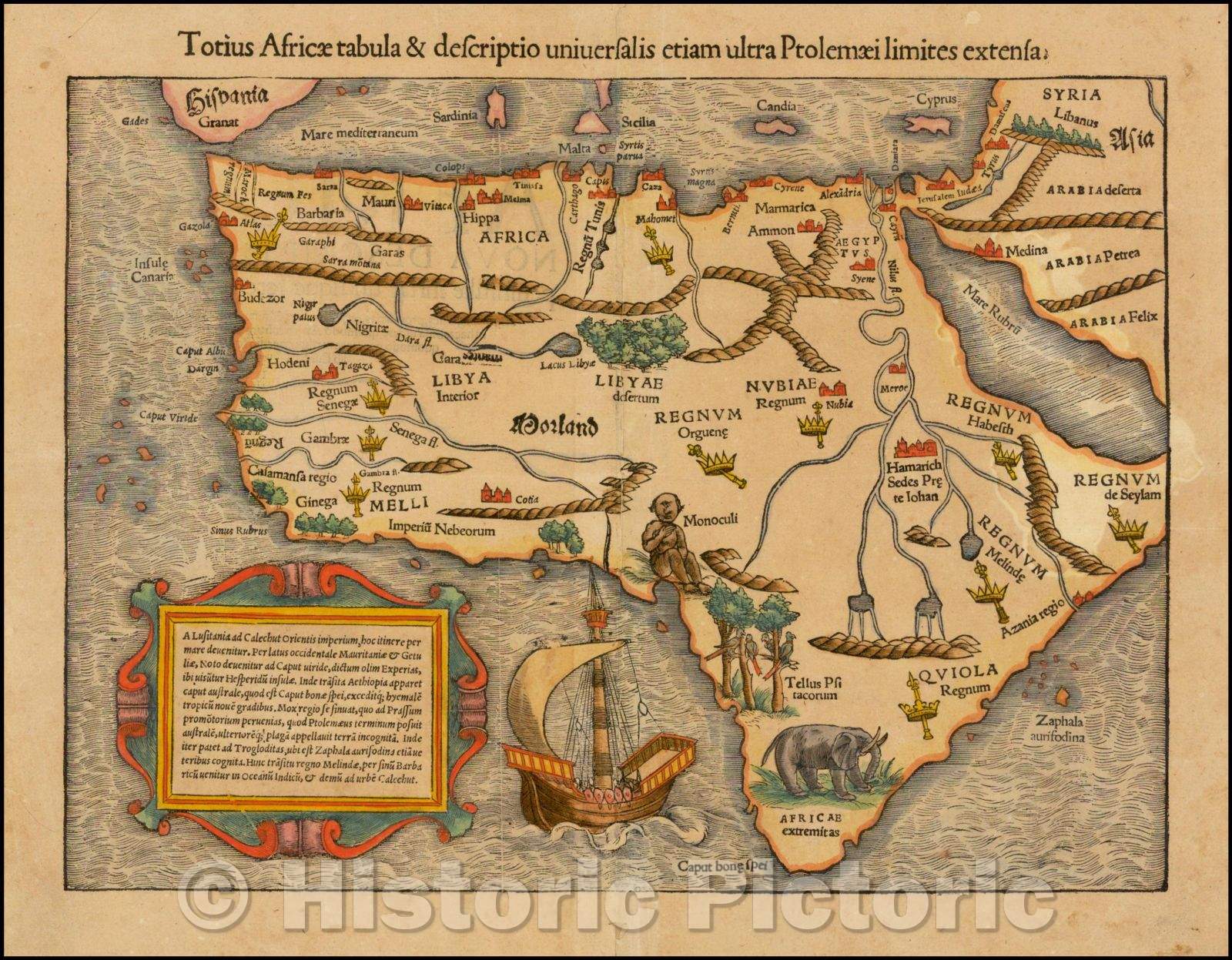 Historic Map - Totius Africae tabula, descriptio universalis, etiam ultra Ptolemaei limites extensa/M?nster's Map of Africa, curious river routes, 1550 - Vintage Wall Art