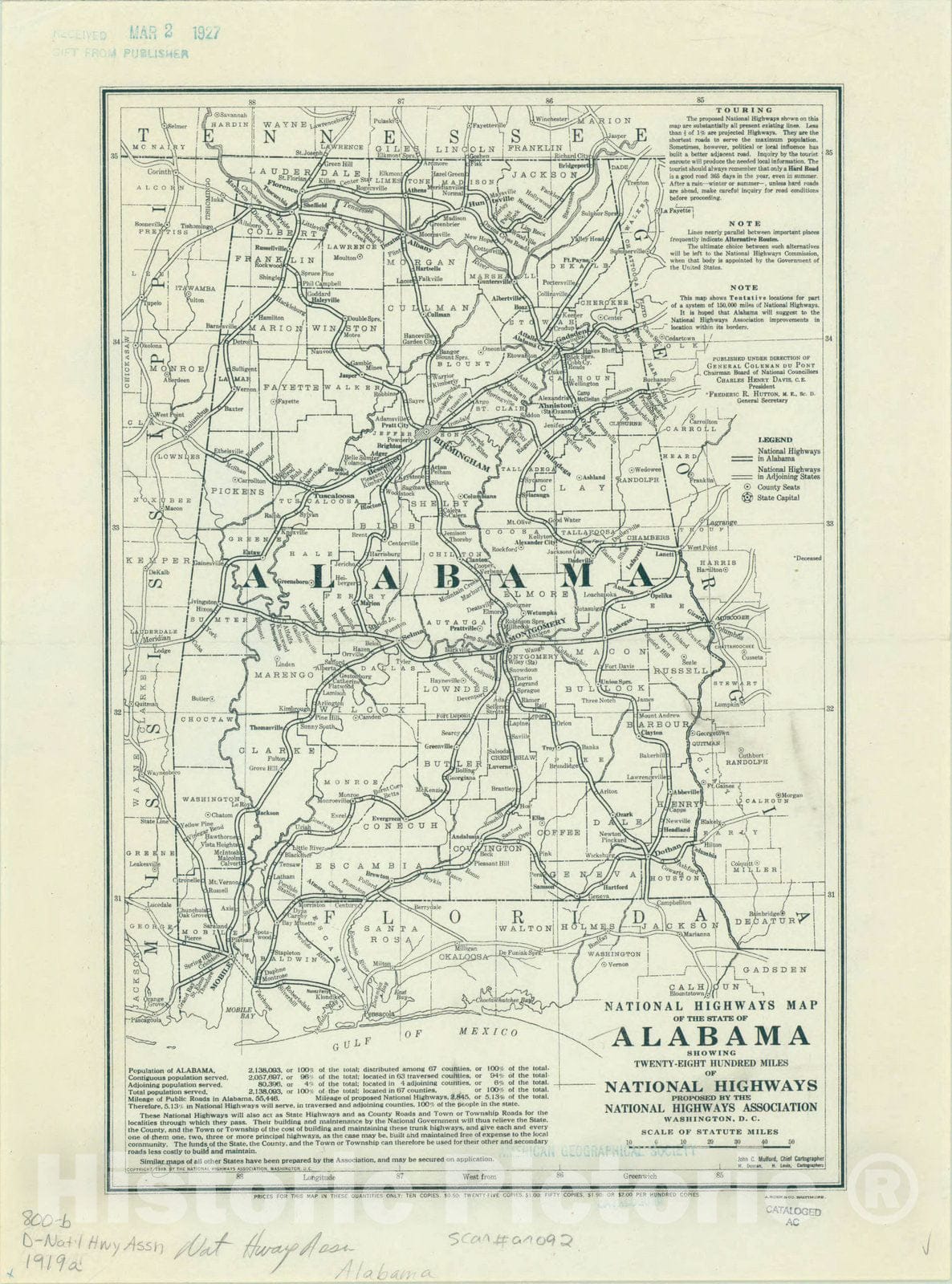 National Highways map of the state of Alabama showing twenty-eight hundred miles of national highways proposed by the National Highways Association / John C. Mulford, Chief Cartographer ; W. Duncan, Cartographer ; H. Louis, Cartographer