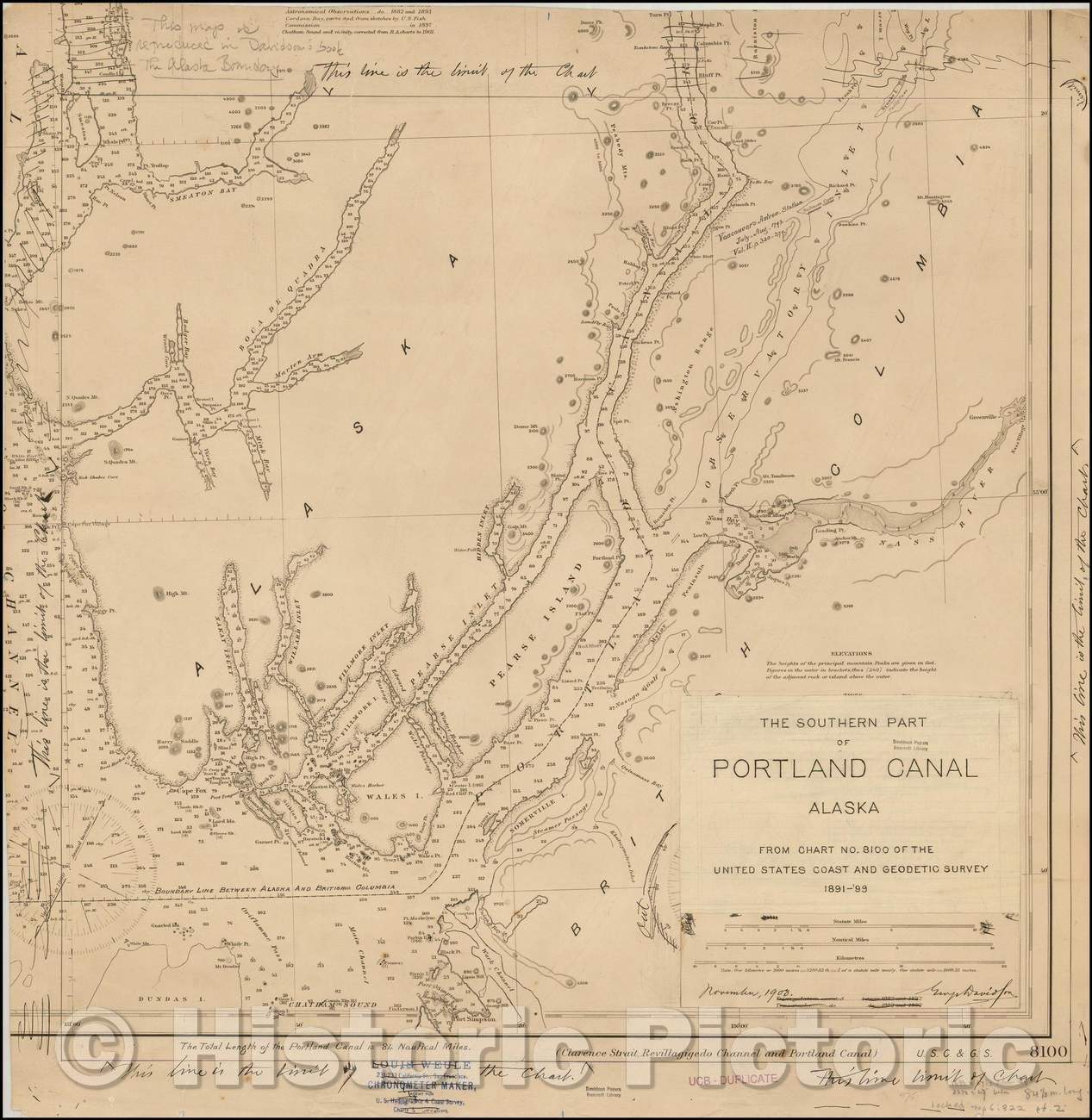 • .Historic Map - The Southern Part of Portland Canal Alaska From Chart No. 8100 of the United States Coast and Geodetic Survey 1891-99, 1903 - Vintage Wall Art