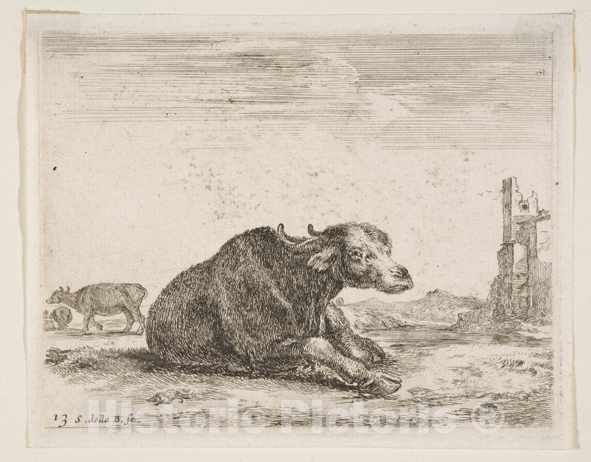 Art Print : Stefano Della Bella - Plate 13: Buffalo Lying Down, from 'Various Animals' (Diversi animali) 2 : Vintage Wall Art