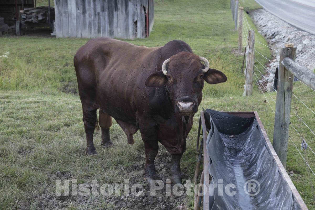 Photo - A Bull with Bison-Like Horns Checks Out a Mostly Empty Drinking Trough in Rural Morgan County, Indiana - Fine Art Photo Reproduction