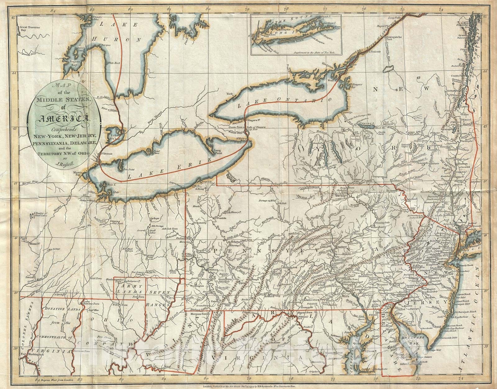 Historic Map : The Middle States of The United States "New York, Ohio, Pennsylvania, New Jersey,, Russel, 1794, Vintage Wall Art