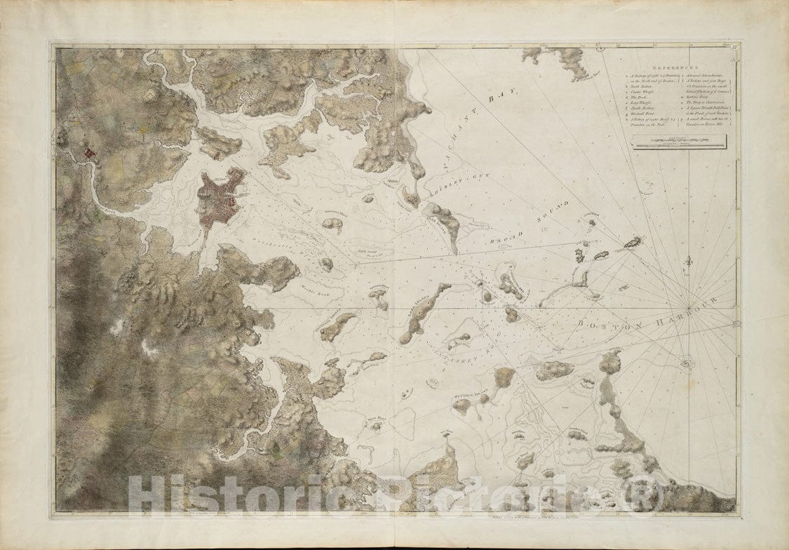This survey of Boston Harbor, first published in 1775 in Des Barres's Atlantic Neptune, was the pre-eminent chart of the harbor produced in the 18th century. It was used by the Royal Navy during the American Revolution, and long after that conflict by American and English merchants. The chart was based on surveys by George Callendar, master of His Majesty's Ship Romney, stationed in Boston Harbor in 1769. Displayed here is the fourth state of the chart which depicts the inland topography in great detail. Roads, taverns, streams and farmhouses are shown throughout the countryside.