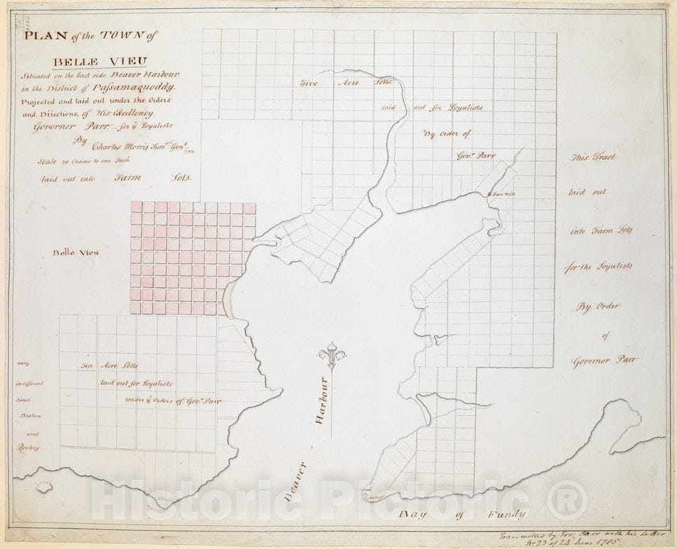 Historical Map, 1785 Plan of The Town of Belle VIEU situated on The East Side Beaver Harbour in The District of Passamaquoddy, Vintage Wall Art