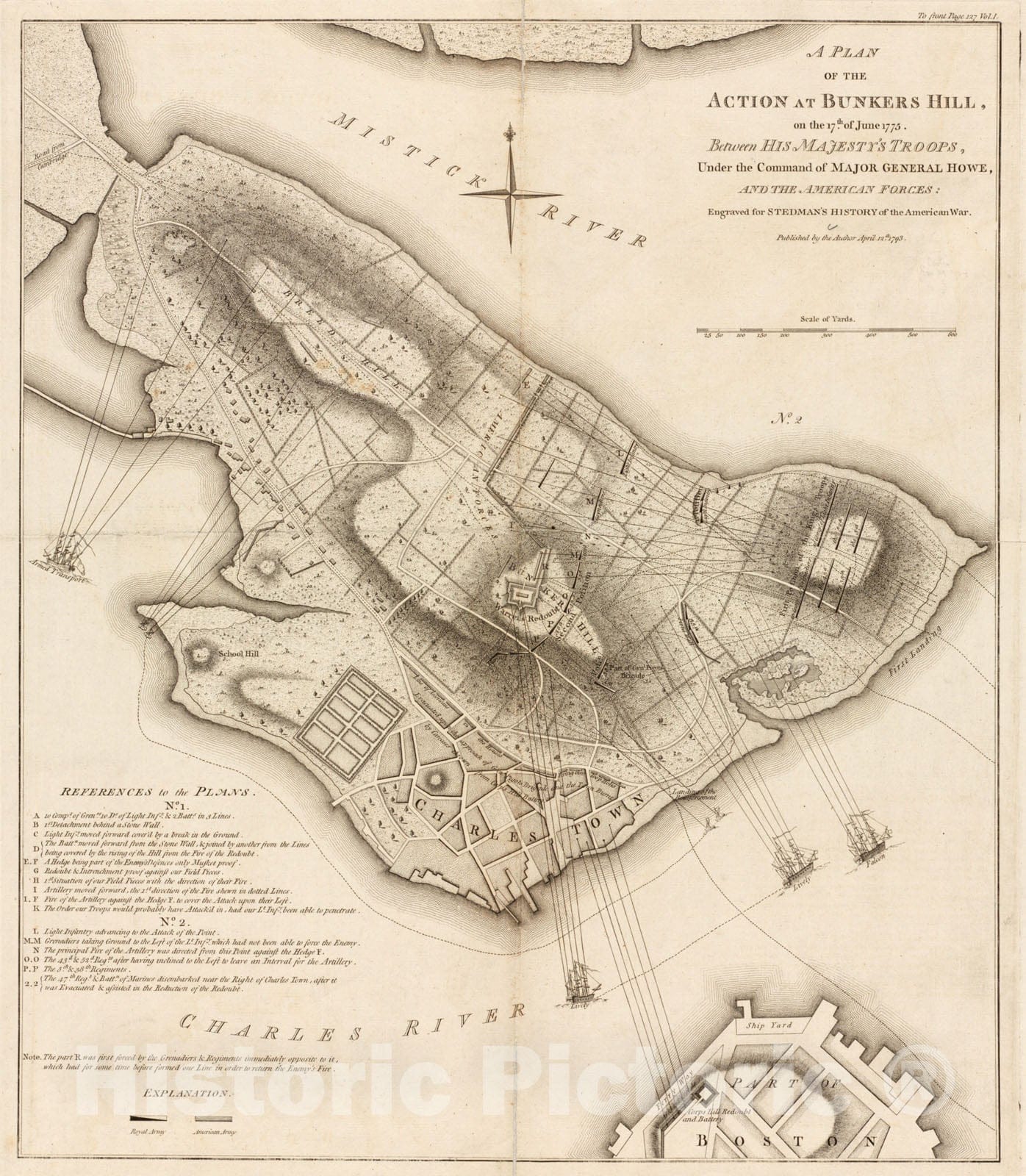 Historical Map, 1793 A Plan of the action at Bunkers Hill on the 17th of June 1775 between His Majesty's troops, under the command of Major General Howe, and the American forces, Vintage Wall Art