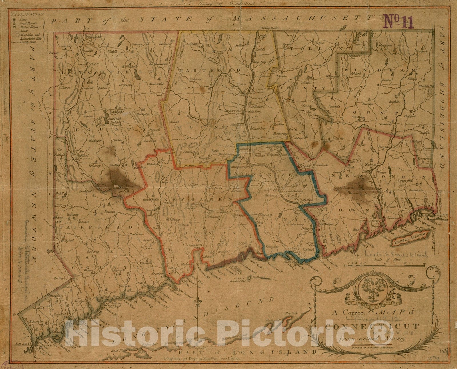 • Historical Map, 1797 A Correct map of Connecticut from Actual Survey, Vintage Wall Art