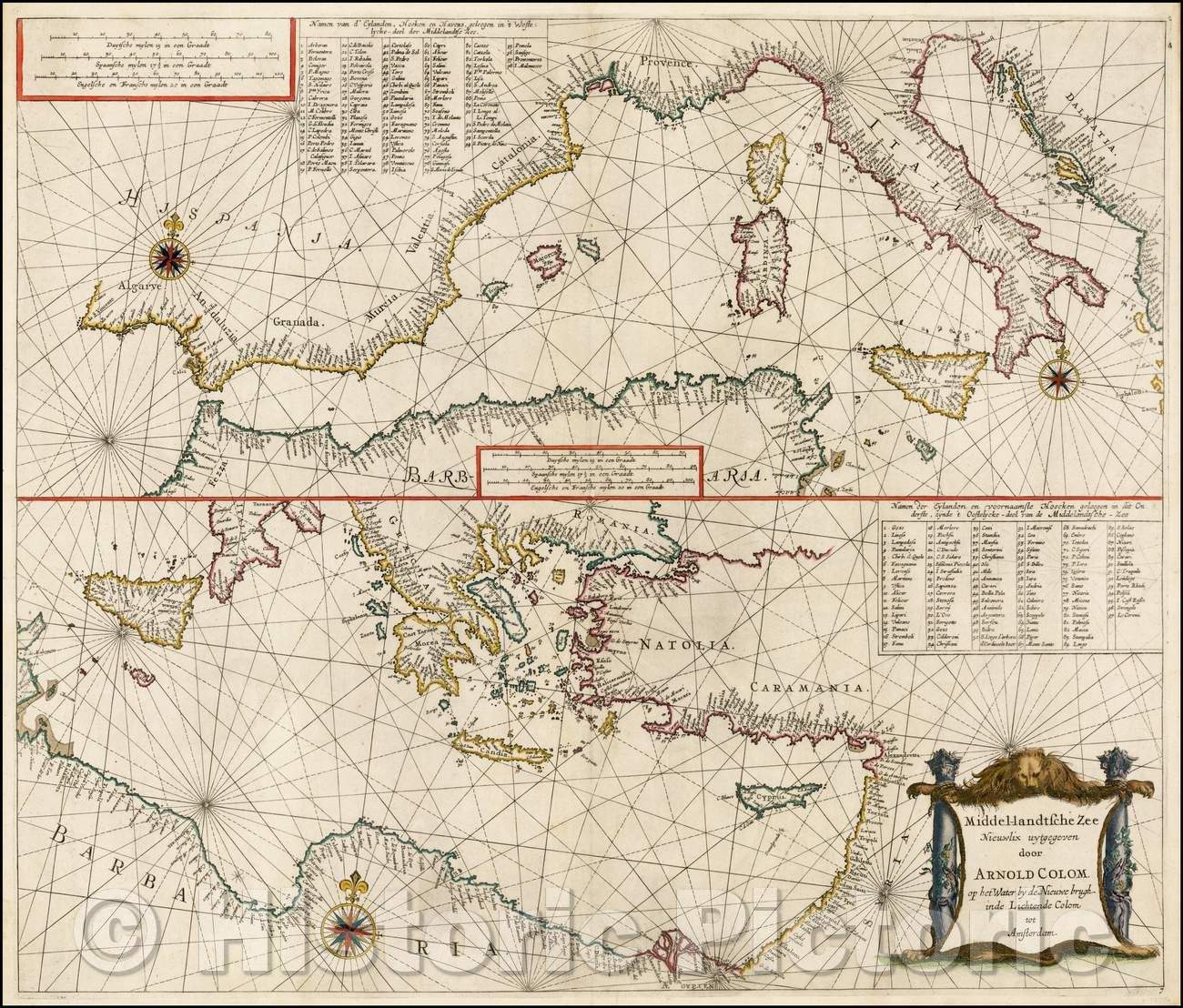 Historic Map - Middel-landtsche Zee Nieuwlix uytgegeven door Arnold Colom/Sea Chart of the Mediterranean, published by Arnold Colom in Amsterdam, 1656 - Vintage Wall Art