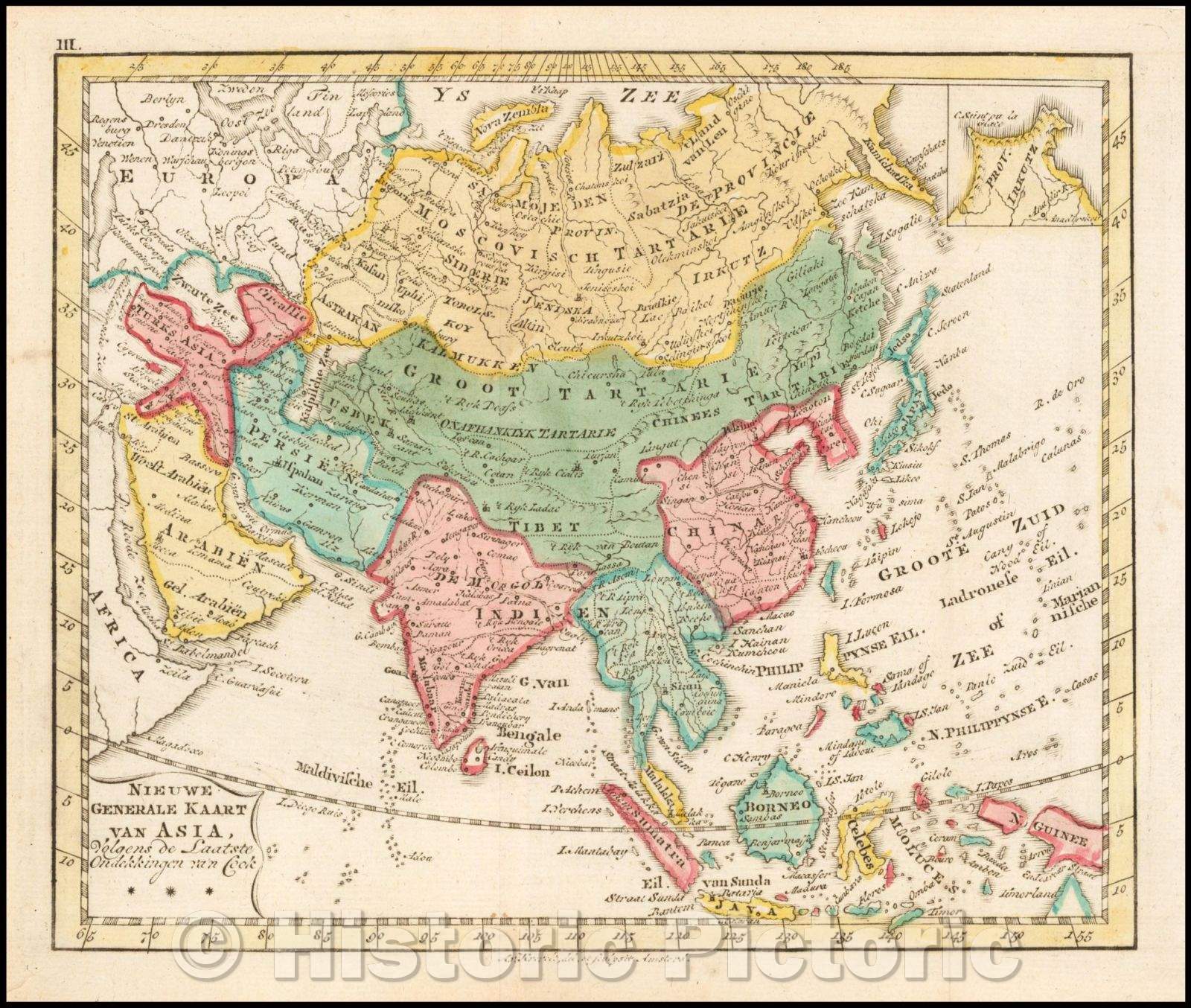 • .Historic Map - Nieuwe Generale Kaart van Asia Volgens de Laatste Ontdekkingen van Capt. Cook/Map of Asia, pubished in Amsterdam by Jan Elwe, 1786 - Vintage Wall Art