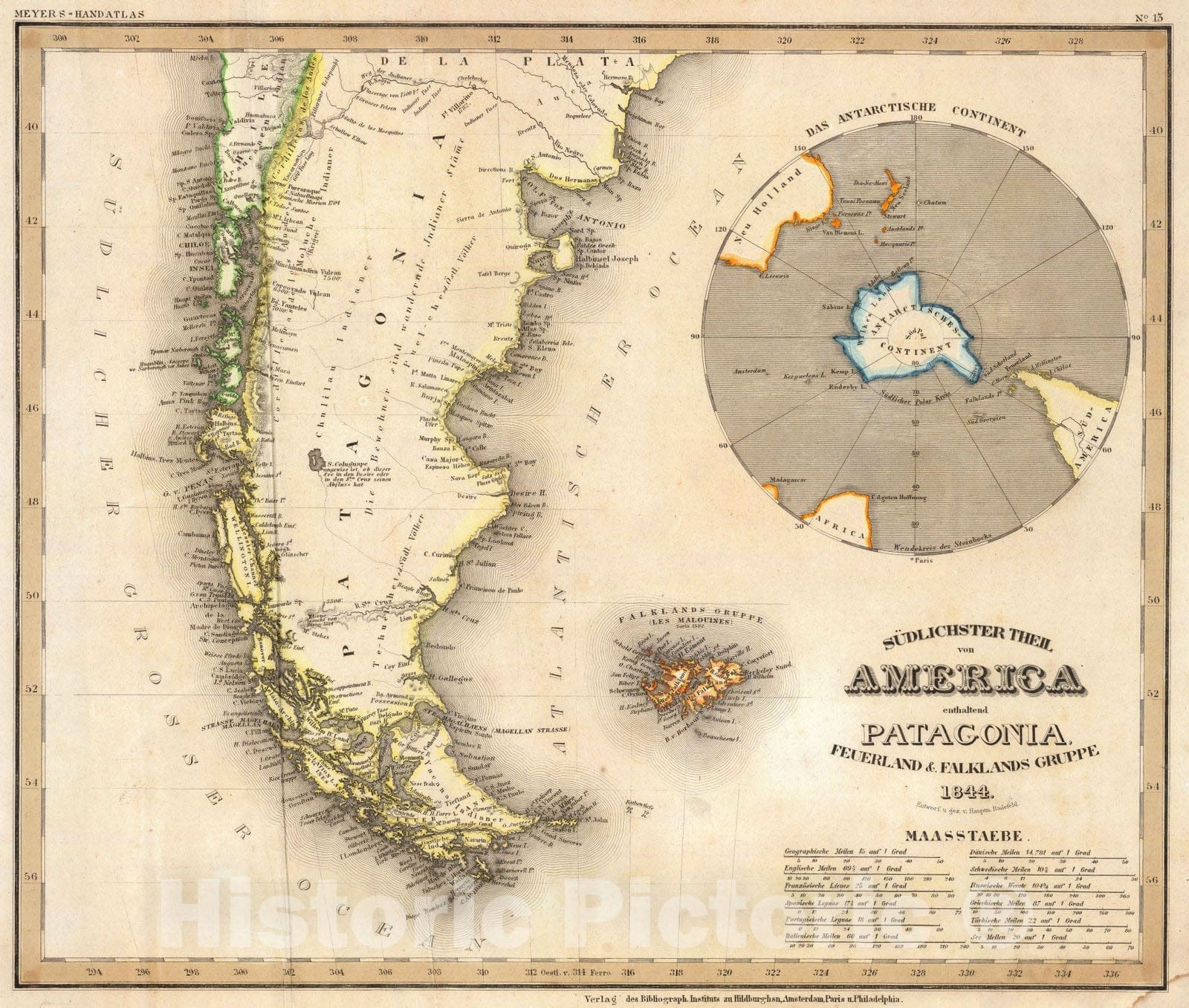 Historic Map : Argentina; Chile, Falkland Islands, Antarctica 1844 Patagonia, Feuerland, Falklands, Antarctische Continent. , Vintage Wall Art