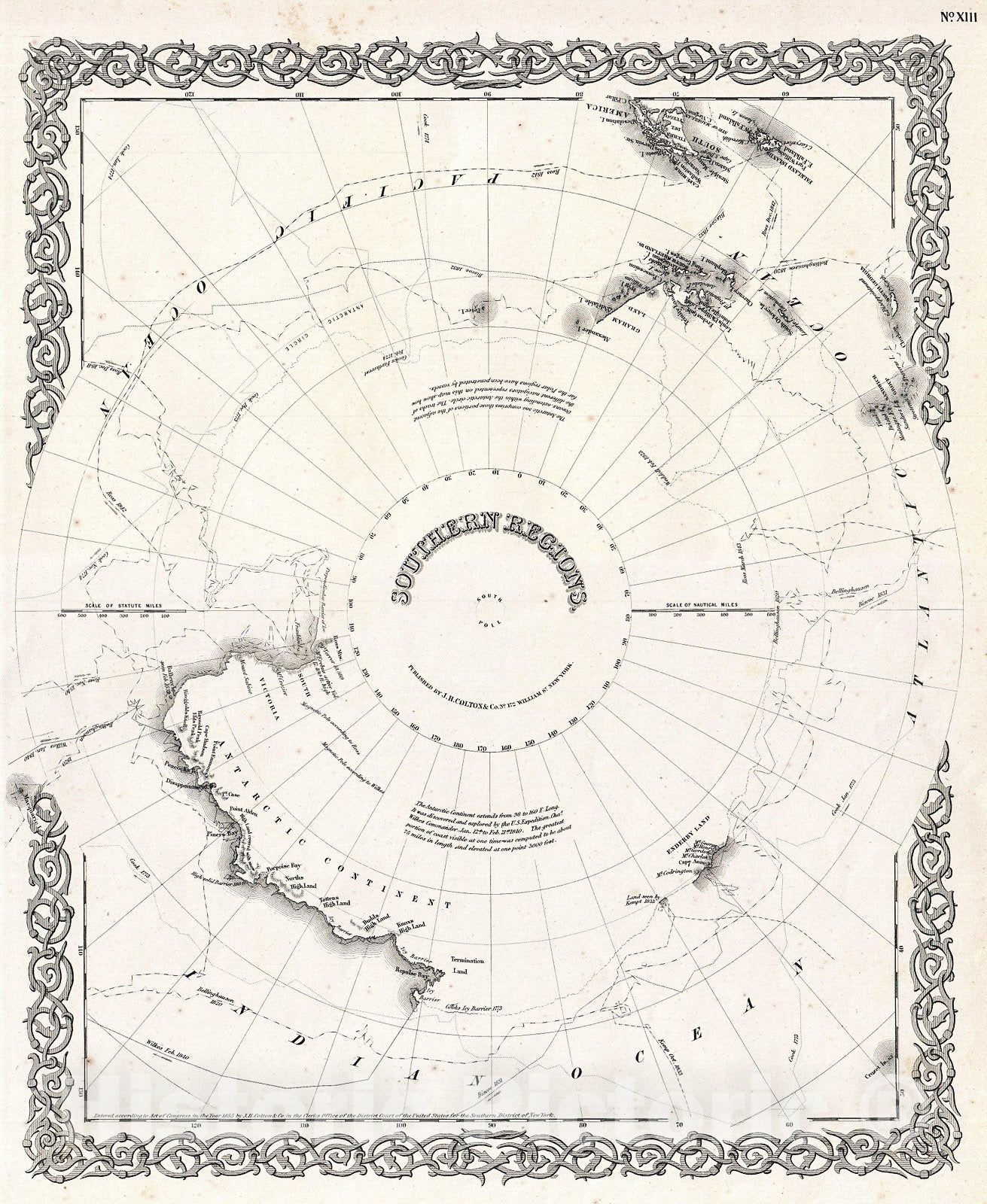 • .Historic Map : Colton Map of Antarctica, The South Pole, or The Southern Polar Regions, 1855, Vintage Wall Art