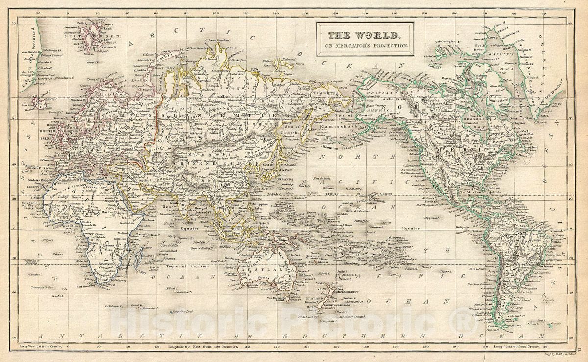 This is a fine example of Adam and Charles Black's 1844 map of the world on Mercator's Projection. An interesting map of the world issued just as most of the Earth's non-polar shore has been explored. Vast stretches of unmapped territory and speculative cartography fill central Africa and Australia. In Africa, Lake Nyasa is shown only speculatively. Neither Mt. Kenya nor Mt. Kilimanjaro are shown. The sea between Japan and Korea, whose name, either the 'Sea of Korea' or the 'Sea of Japan,' is currently a matter of historical and political dispute between the two countries, is here identified in favor of Japan. The map is color coded according to continents with counties named but their boundaries not defined. Various important cities, rivers, islands, mountain ranges, and several other topographical details are noted with relief shown by hachure. This map was engraved by George Aikman for issue as plate no. II in the 1844 edition of Black's General Atlas.