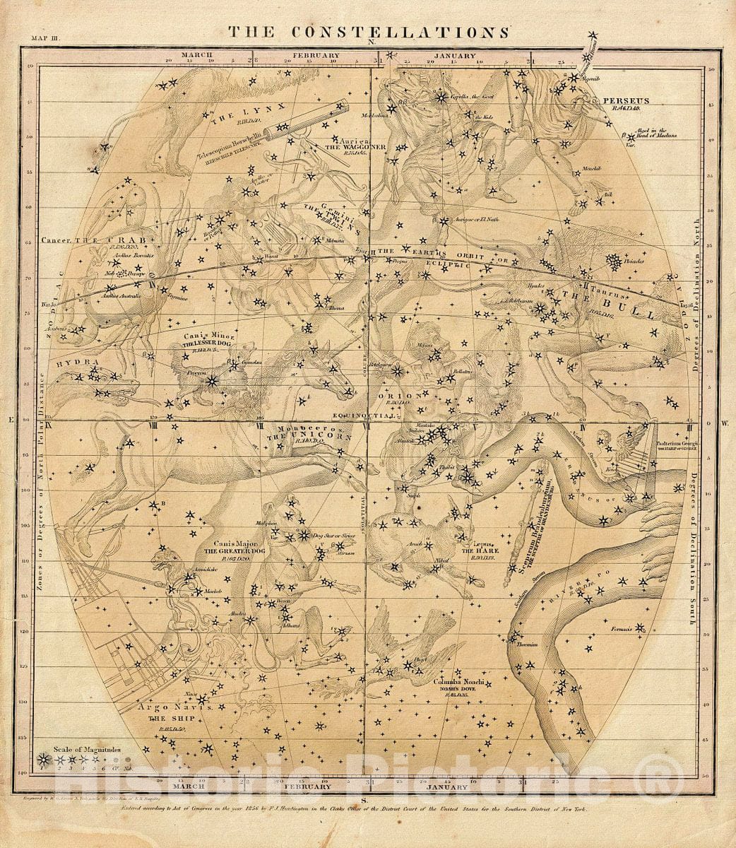 This rare hand colored map of the stars was engraved W. G. Evans of New York for Burritt's 1835 edition of the Atlas to Illustrate the Geography of the Heavens. It represents the Northern night sky in the months of January, February and March. Constellations are drawn in detail and include depictions of the Zodiacal figures the stars are said to represent. Included on this chart are Taurus (the Bull), Gemini (the Twins), Cancer (the Crab), Canis Major (the Greater Dog), Canis Minor (the Lesser Dog) and Orion. The chart is quartered by lines indicating the Solstitial and Equinoctial Colures. This map, like all of Burritt's charts, is based on the celestial cartographic work of Pardies and Doppelmayr. Dated and copyrighted: 'Entered according to Act of Congress in the year 1856 by F. J. Huntington in the Clerks Office of the District Court of the United States for the Southern District of New York.' This map was issued as plate no. III in the Mason Brother's 1856 edition of Atlas, Designed to Illustrate Burritt's Geography of the Heavens.