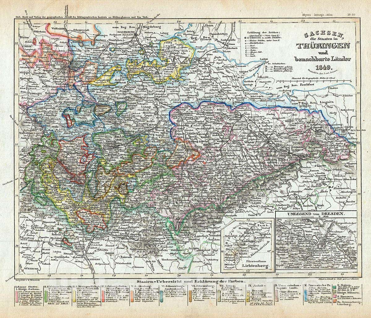 This is a scarce 1849 map of Sain xony, the States of Thuringia and neighboring countries by Joseph Meyer. It covers the region from Magdeburg south to Bamberg and from Gottingen east as far as Gorlitz. Throughout the map identifies various cities, towns, rivers and an assortment of additional topographical details. Two insets in the lower right quadrant feature the Principality of Lichtenberg and Dresden and vicinity.