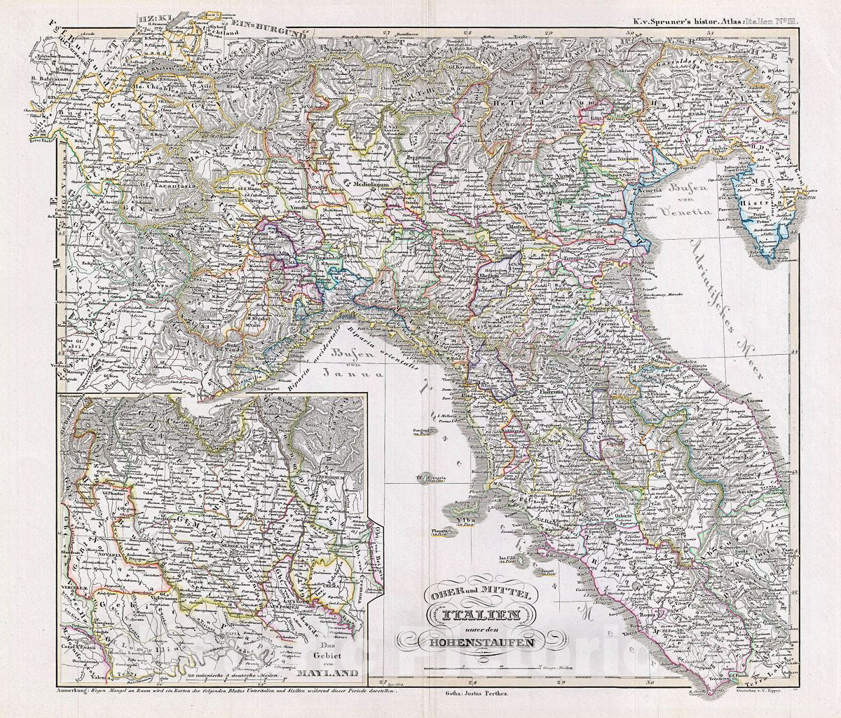 This is Karl von Spruner's 1854 historical map of upper and central Italy under the Hohenstaufen. The map covers all Italy from the Trentino-Alto Adige region to Lazio. An inset map on the bottom left corner details the area of Milan (Mayland). The map depicts a time when Italy was ruled by the House of Hohenstaufen. The whole is rendered in finely engraved detail exhibiting throughout the fine craftsmanship of the Perthes firm. Prepared by Karl Spruner for publication as plate It III in the second edition of Justus Perthes' 1854 Historich-Geographischer, Hand-Atlas zur Geschichte der Staaten europa's vom Anfang des Mittelalters bis auf die Neueste Zeit.