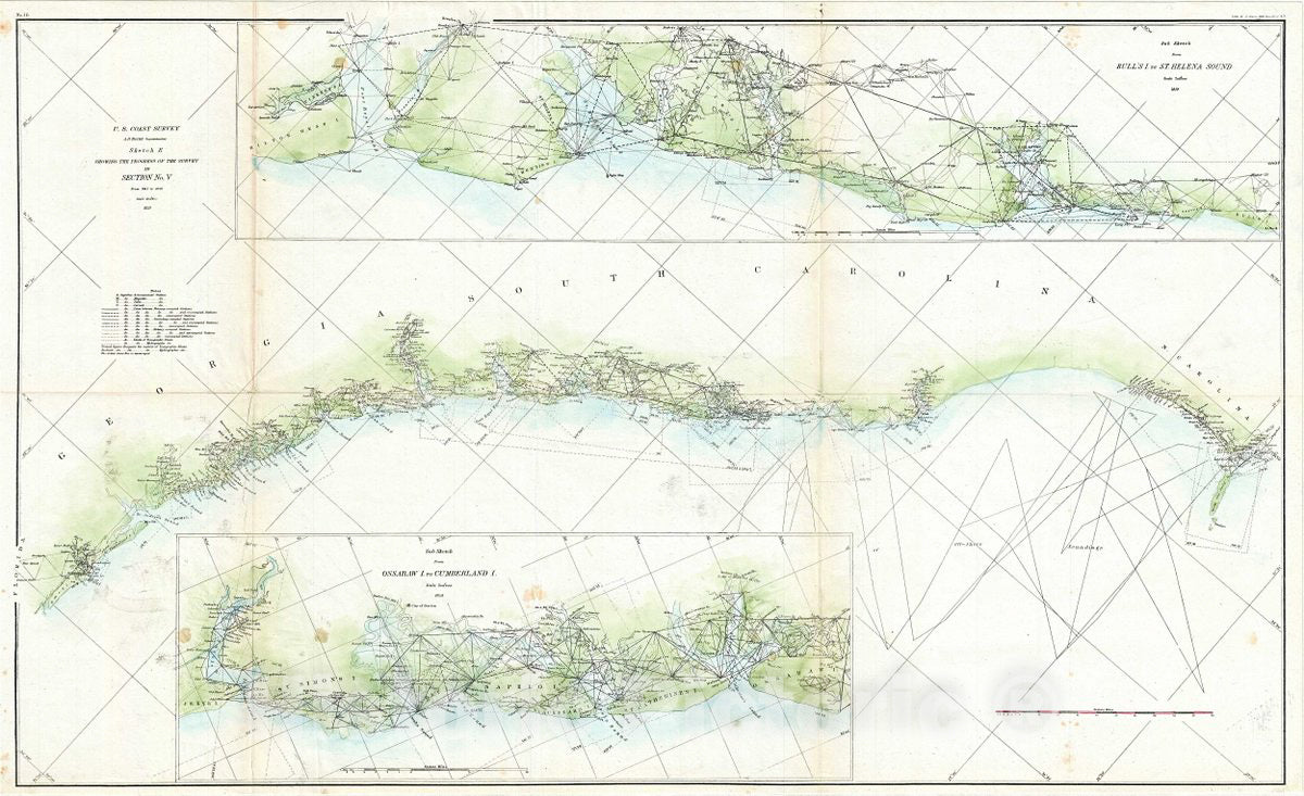 This is an appealing 1859 U.S. Coast Survey triangulation chart or map of the Georgia and South Carolina coastline from Cumberland Island to Bald Head Island in North Carolina. Essentially three maps on a single sheet, the top map features a triangulation of the coast from Hilton Head (Port Royal Sound) to Charleston. The bottom map extends from Ossabaw Island to Cumberland Island. Focuses on the inlets and waterways, indicates, lighthouses and important channels and shows the progress of the survey work in this area by date-annotated sections. Nautically this map offers a wealth of practical information for the Mariner, including countless depth soundings and notes on light hoses, tides, shoals, and other undersea dangers.