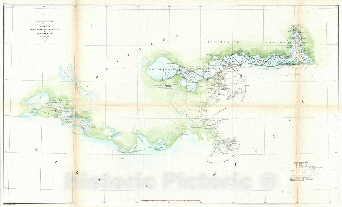 A very attractive example of the 1860 U.S. Coast Survey nautical chart or map of the Mississippi River Delta and environs. Centered on the fanlike river delta itself, this map extends westward as far as Marsh Island and Vermillion Bay and eastward along the Mississippi Sound as far as Mobile Bay, Alabama. The course of the Mississippi River is charted as far north as New Orleans and Lake Pontchartrain. Countless triangulation points are noted throughout, particularly in Cote Blanche Bay, the Mississippi River Delta, the Mississippi Sound, and Mobile Bay. The chart was produced under the supervision of A. D. Bache, one of the most influential Superintendents in the history of the Coast Survey, and issued for the 1860 Superintendent's Report.