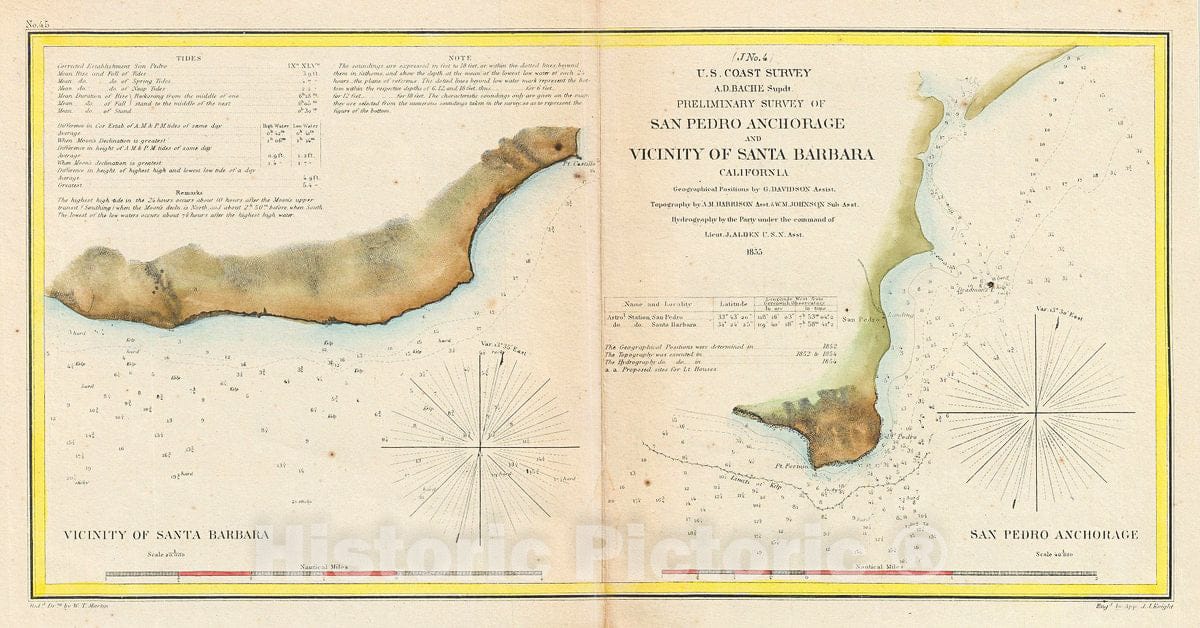 An uncommon example of the 1859 U.S. Coast Survey nautical chart or maritime map of Santa Barbara and San Pedro (Los Angeles), California. essentially two maps on a single sheet, the left hand map details the stretch of land that would eventually evolve into the city of Santa Barbara. When the Coast Survey issued this map Santa Barbara was, for all intent and purposes, uninhabited. The right hand map focuses on Point Fermin and the San Pedro Anchorage. When this map was issued the mission and landing at San Pedro had been established, as had the Los Angeles Mission further north. Today the modern city of Los Angeles incorporates this entire area. As a nautical map it further includes countless depth soundings (in feet) and a wealth of practical information for the mariner. The triangulation for this map was completed by G. Davidson. The topography is the word of A. M. Harrison and W. M Johnson. The hydrography was accomplished by a team under the command of J. Alden. The whole was compiled under the direction of A. D. Bache, one of the U.S. Coast Survey's most influential and prolific superintendents, for issue in the 1855 annual report to Congress.