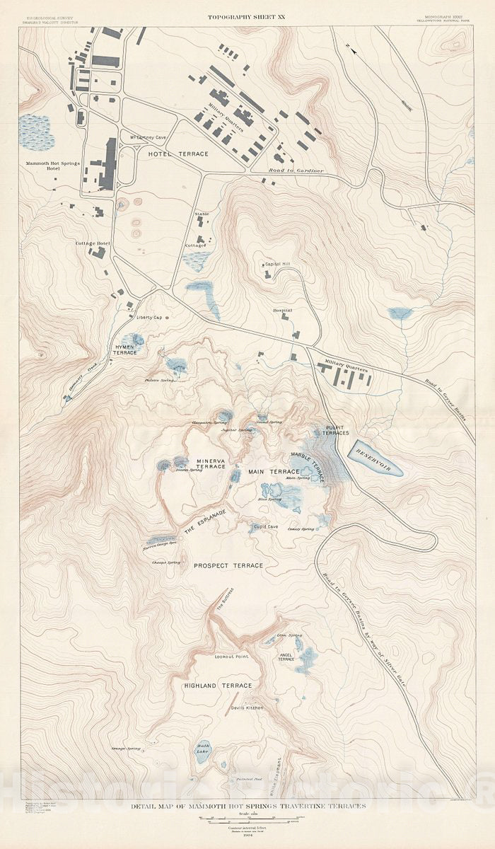 Arnold Hague's 1904 topographical survey map of the spectacular Mammoth Hot Springs Travertine Terraces in Yellowstone National Park, Wyoming. Centered on the Cleopatra Spring in Minerva Terrace, this detailed map covers the Travertine Terraces from the Painted Pool on the White Elephant in Highland terrace to the McCartney Cave in Hotel Terrace. It also identifies Liberty Cap on the Hymen Terrace. Building over thousands of years and still growing, the Mammoth Terraces constantly change shape and color. The map also features some roads and buildings including the famous Mammoth Hot Springs Hotel, military quarters, the Cottage Hotel, Capitol Hill, a hospital, a stable and a cottage. This particular map was part of Hague's study of the regions unique geology and the related geothermal activity. Published by the United States Geological Survey in 1904.