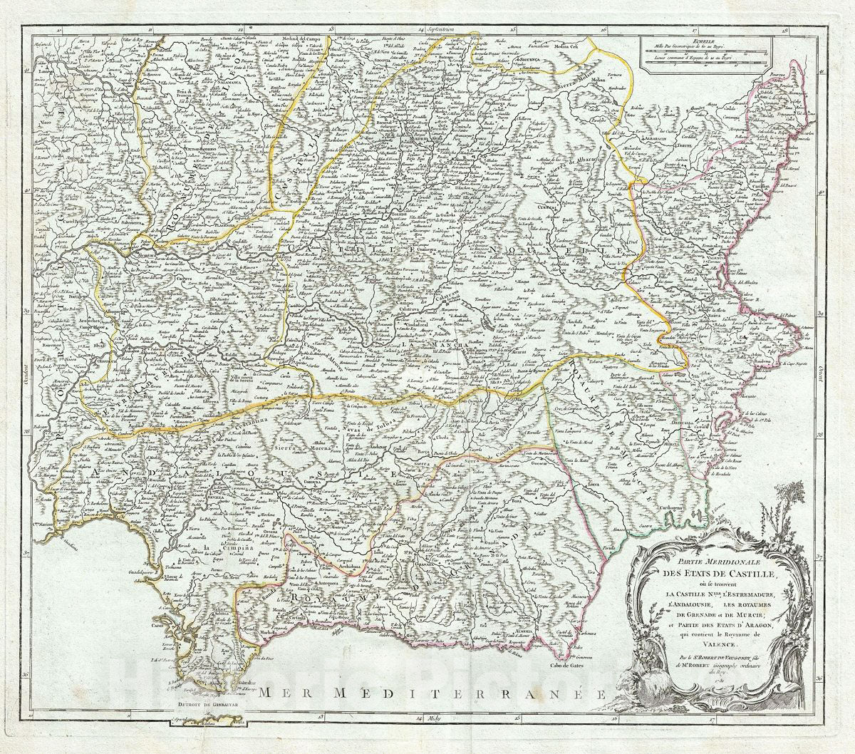 Historic Map : Vaugondy Antique Map of Southern Spain (Castile, Andalusia, EIN xtremadura, Murcia, Valencia), 1751, Vintage Wall Art