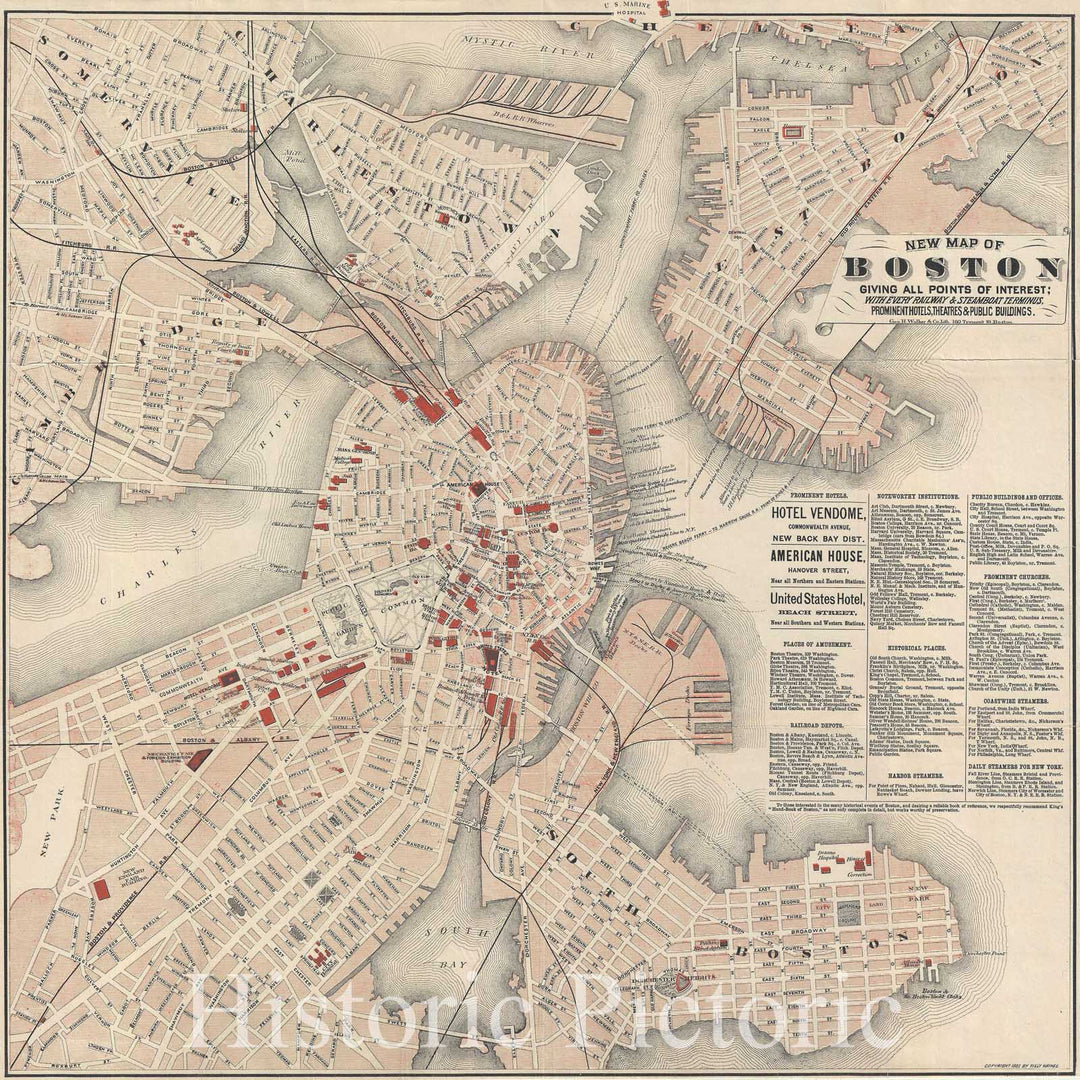 Historic Map : Walker Antique Map or Plan of Boston, Massachusetts, 1883, Vintage Wall Art