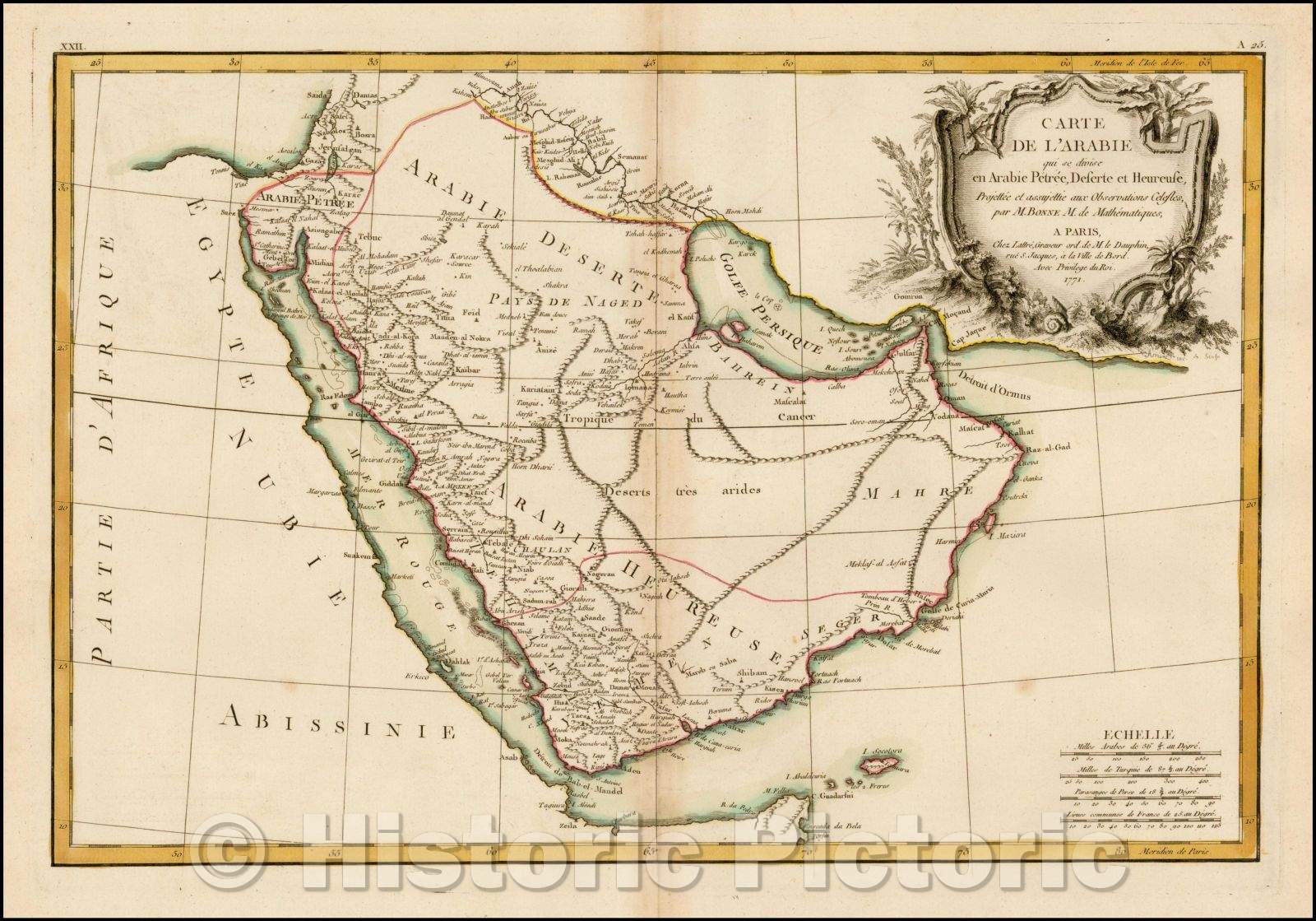 • .Historic Map - Carte De L'Arabie qui se divise en Arabie Petree, Deserte et Heureuse/Map of the Arabian Peninsula, Red Sea and environs, 1771, Jean Lattre - Vintage Wall Art