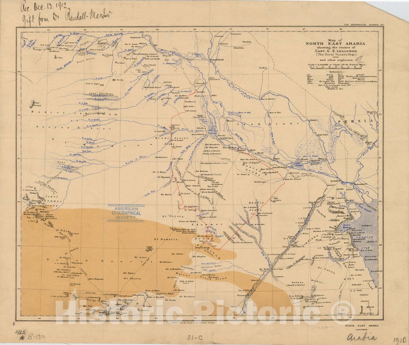 Map of north east Arabia showing the routes of Capt. G.E. Leachman (the Royal Sussex Regt.) 1910 / published by the Royal Geographical Society.