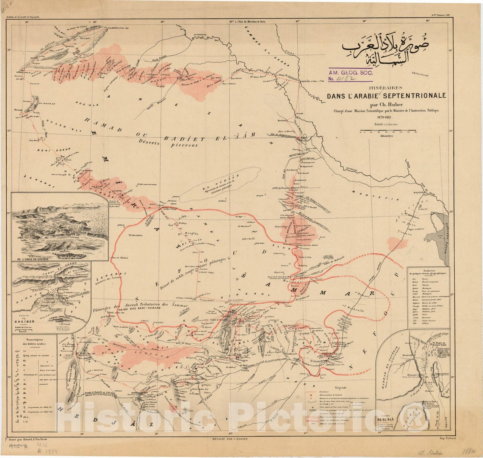 Map : Northern Arabian Peninsula 1884, Itineraires dans l'Arabie septentrionale, Surat bilad al-Arab al-shamaliyah , Antique Vintage Reproduction