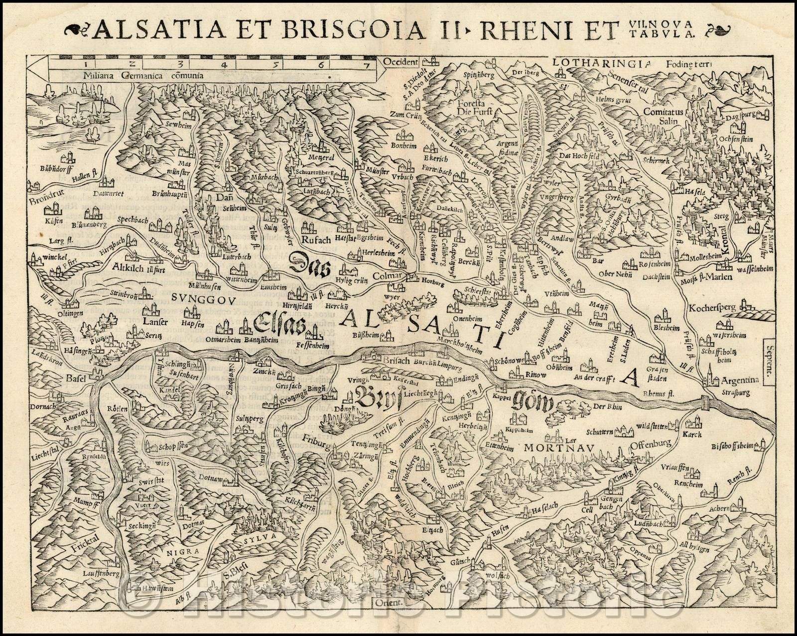 Alsatia et Brisgoia II Rheni Et VII Nova Tabula / Map of the Rhine River Valley, from Strasbourg and Argentina to Basel and Laufenberg, 1542