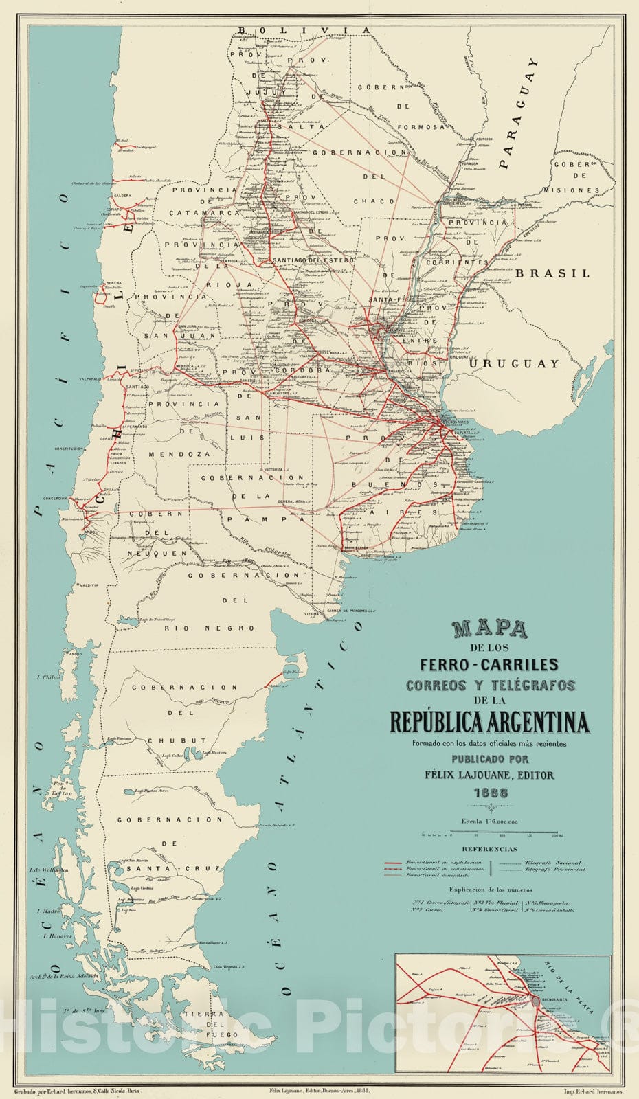 Historic Map : Argentina, 1888 Ferro-carriles, correos y telegrafos, Republica Argentina. , Vintage Wall Art