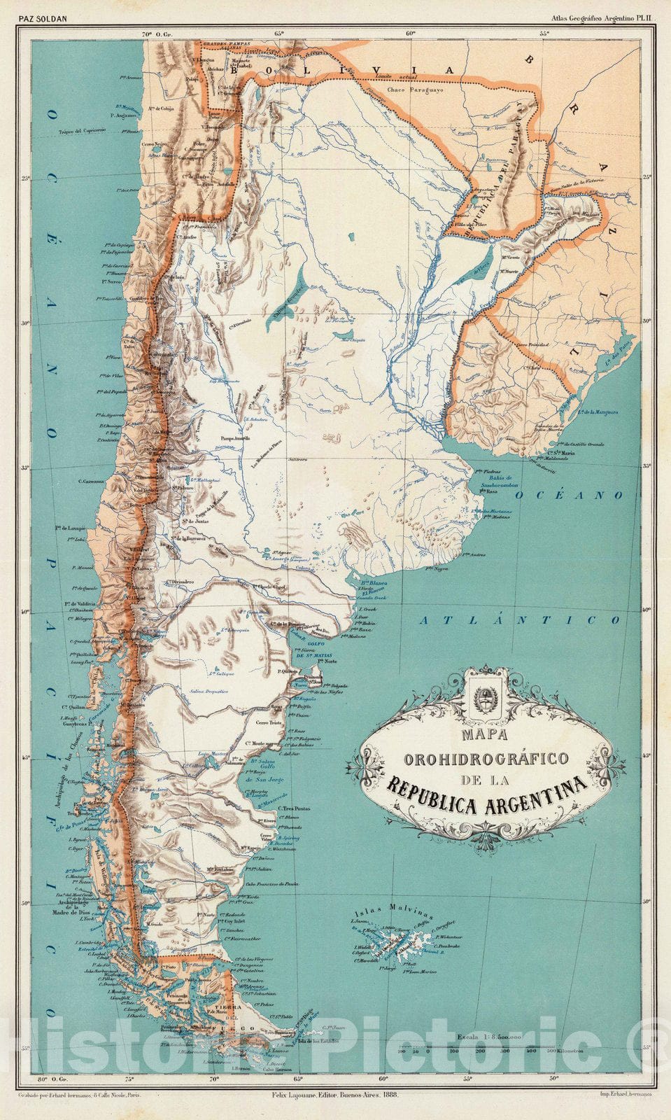 Historic Map : Argentina, 1888 Mapa orohidrografico de la Republica Argentina. , Vintage Wall Art