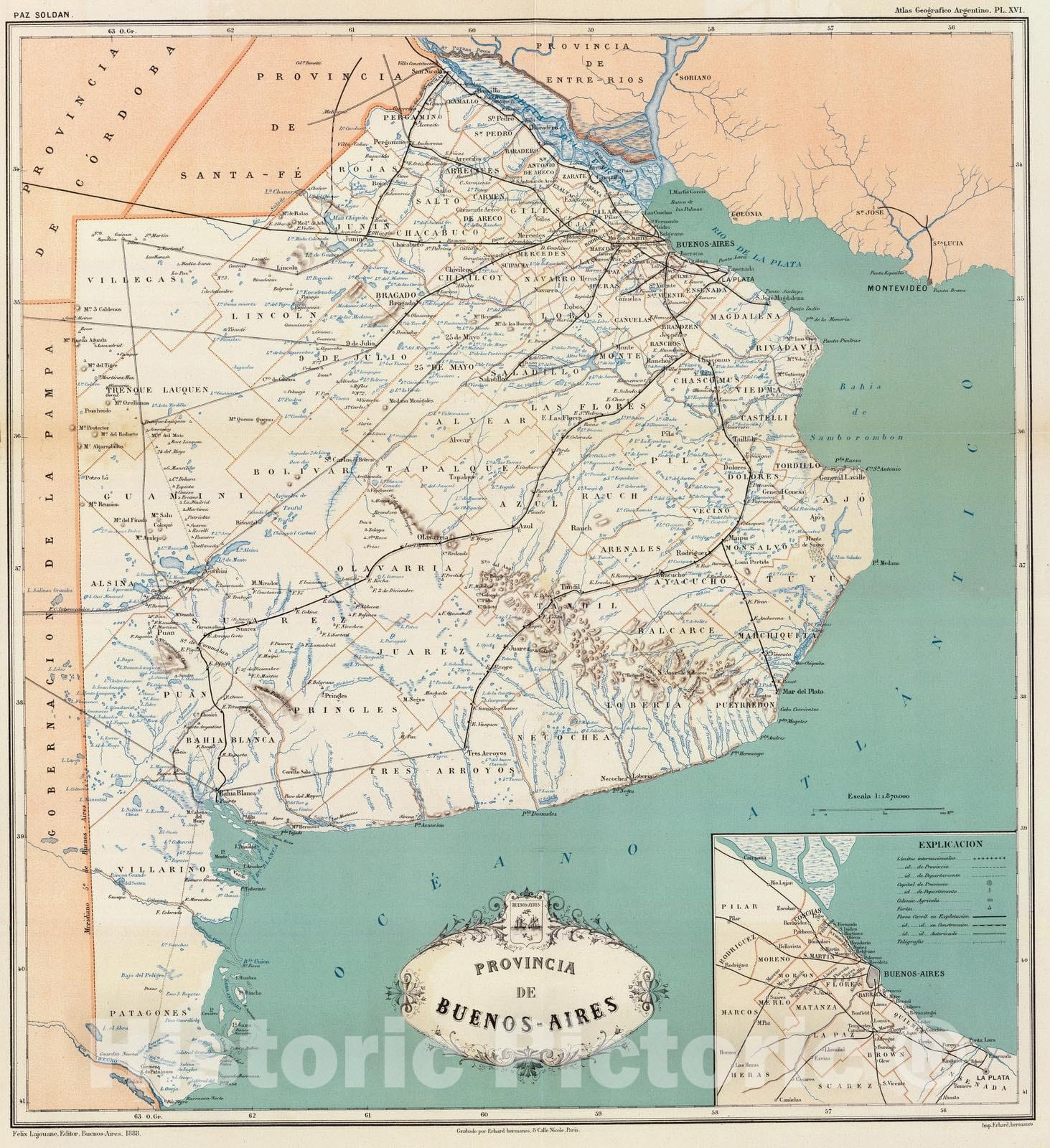 • Historic Map : Argentina, Buenos Aires (Argentina : Province) 1888 Provincia de Buenos-Aires. , Vintage Wall Art