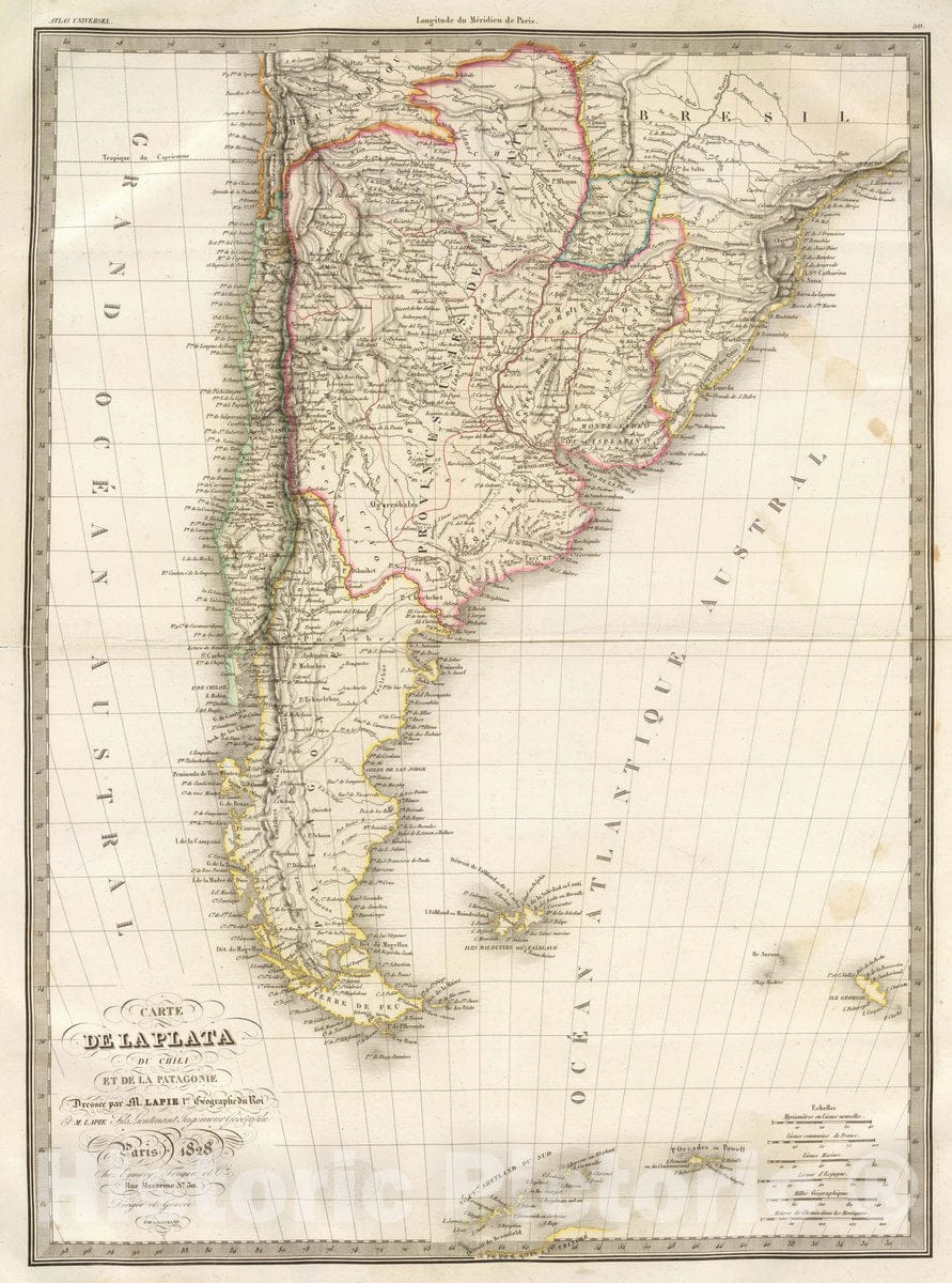 Historic Map : Argentina; Chile, , South America Carte de la Plata, du Chili, et de la Patagonie, 1828 , Vintage Wall Art