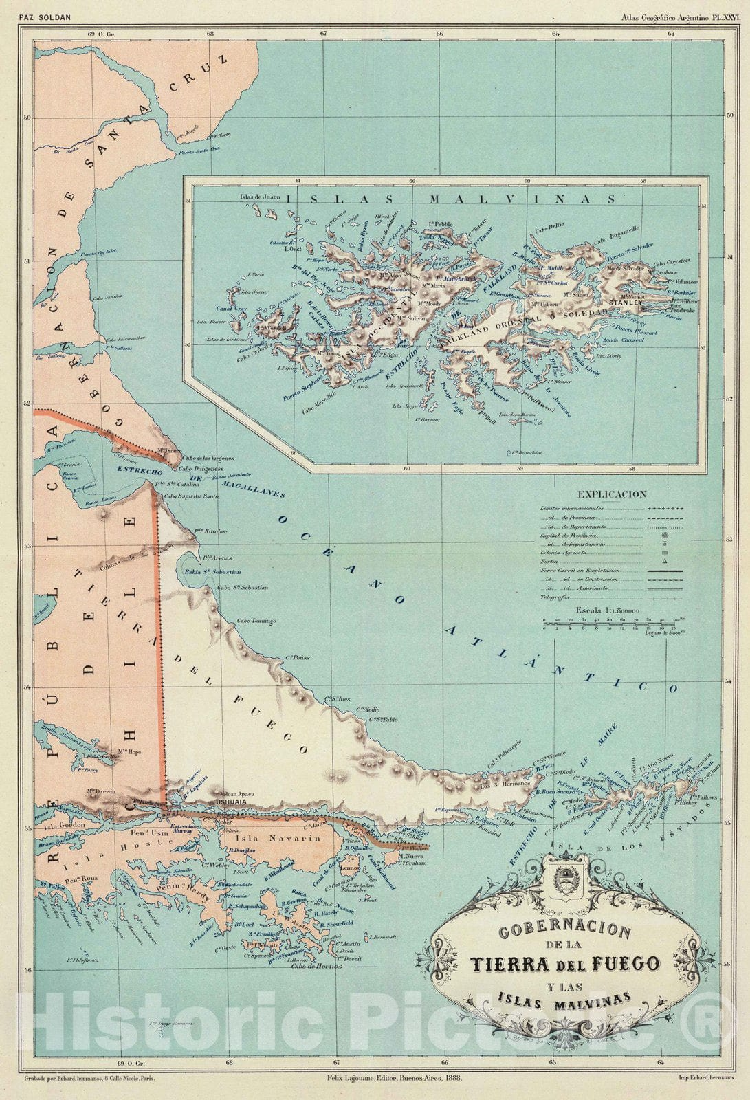 Historic Map : Argentina, Falkland Islands 1888 Gobernacion de la Tierra del Fuego, Islas Malvinas. , Vintage Wall Art