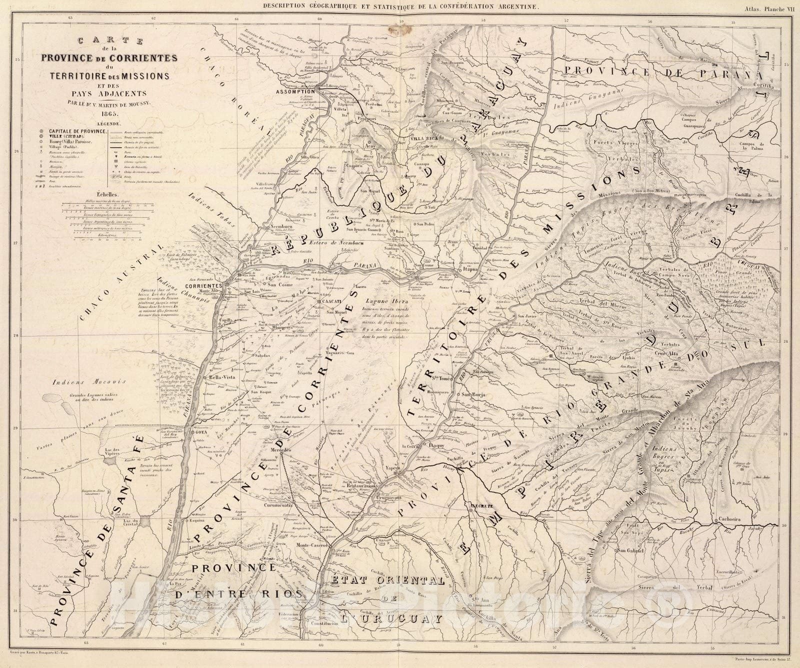 Historic Map : Argentina; Paraguay, Corrientes (Argentina : Province) 1873 Carte, Prov. de Corrientes, Terr. des Missions, pays adjacents. , Vintage Wall Art