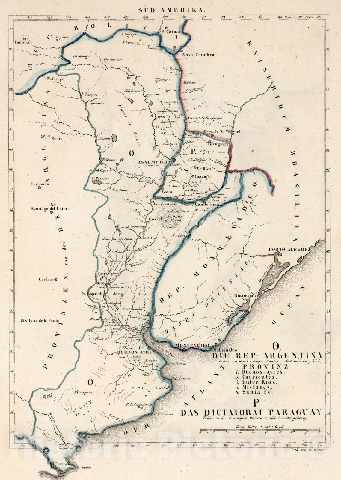 O. Die Rep. Argentina. Provinz ... P. Die Dictatorat Paraguay. (on top margin) Sud Amerika. Lith. v. W. Werner. (insets) Fernado de Noronho b. Trinidade. (to accompany) Atlas von Amerika in 30 Charten und einem erlauterndem Texte. | Atlas von Amerika in 30 Charten und einem erlauterndem Texte. Entworfen von W. E. A. von Schlieben ; die Charten lithographirt, Werner. Leipzig, bei George Joachim Goschen, 1830. | Atlas of America, with 54 pages of text, index, abbreviations,and outline hand color maps, some folded. Includes Index. Bound in beige cardboard covers with decorative border, 35x26.5, title " W. E. A. von Schlieben, Atlas von Amerika. Leipzig, bei George Joachim Goschen".