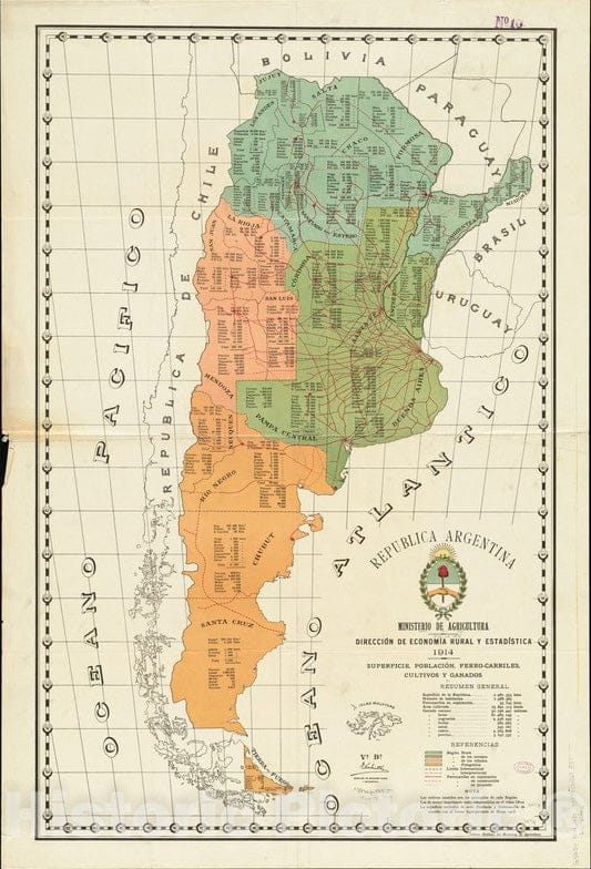 Historical Map, 1914 Republica Argentina : superficie, poblacioIn, Ferro-carriles, cultivos y ganados, Vintage Wall Art