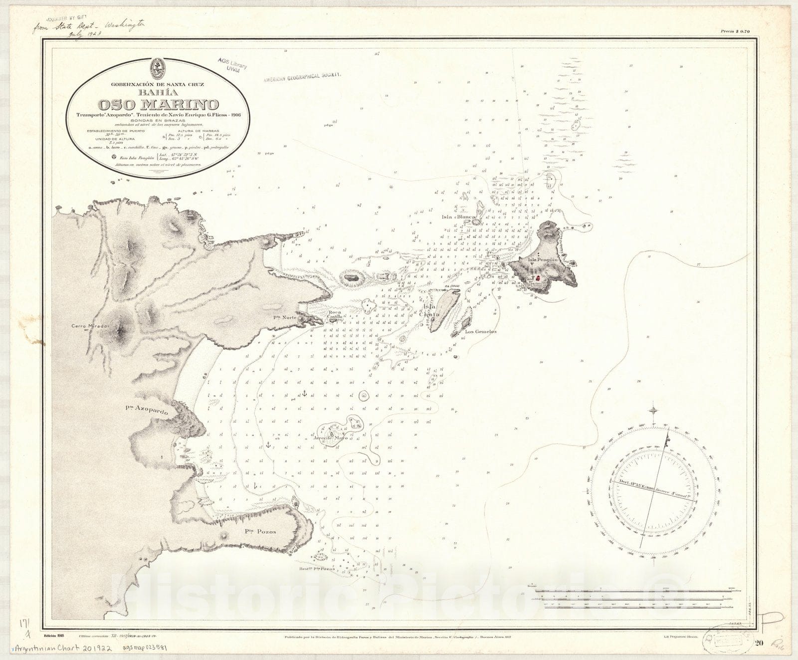Map : Bahia Oso Marino, Argentina 1922, Gobernacion de Santa Cruz, Bahia Oso Marino , Antique Vintage Reproduction