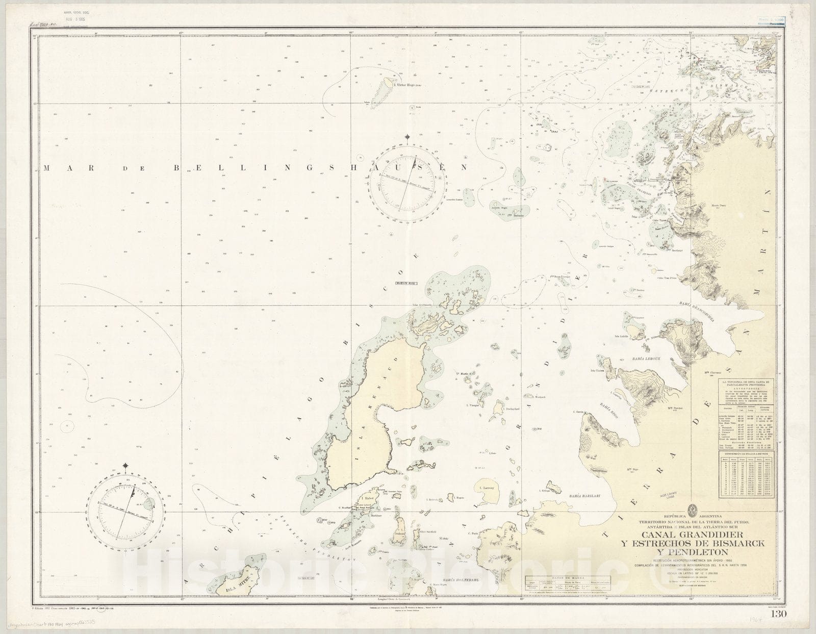 Republica Argentina, Territorio Nacional de la Tierra del Fuego, Antartida e Islas del Atlantico Sur, Canal Grandidier y Estrechos de Bismarck y Pendleton / restitucion aerofotogrametrica sin apoyo 1956 compilacion de levantamientos hidrograficos del S