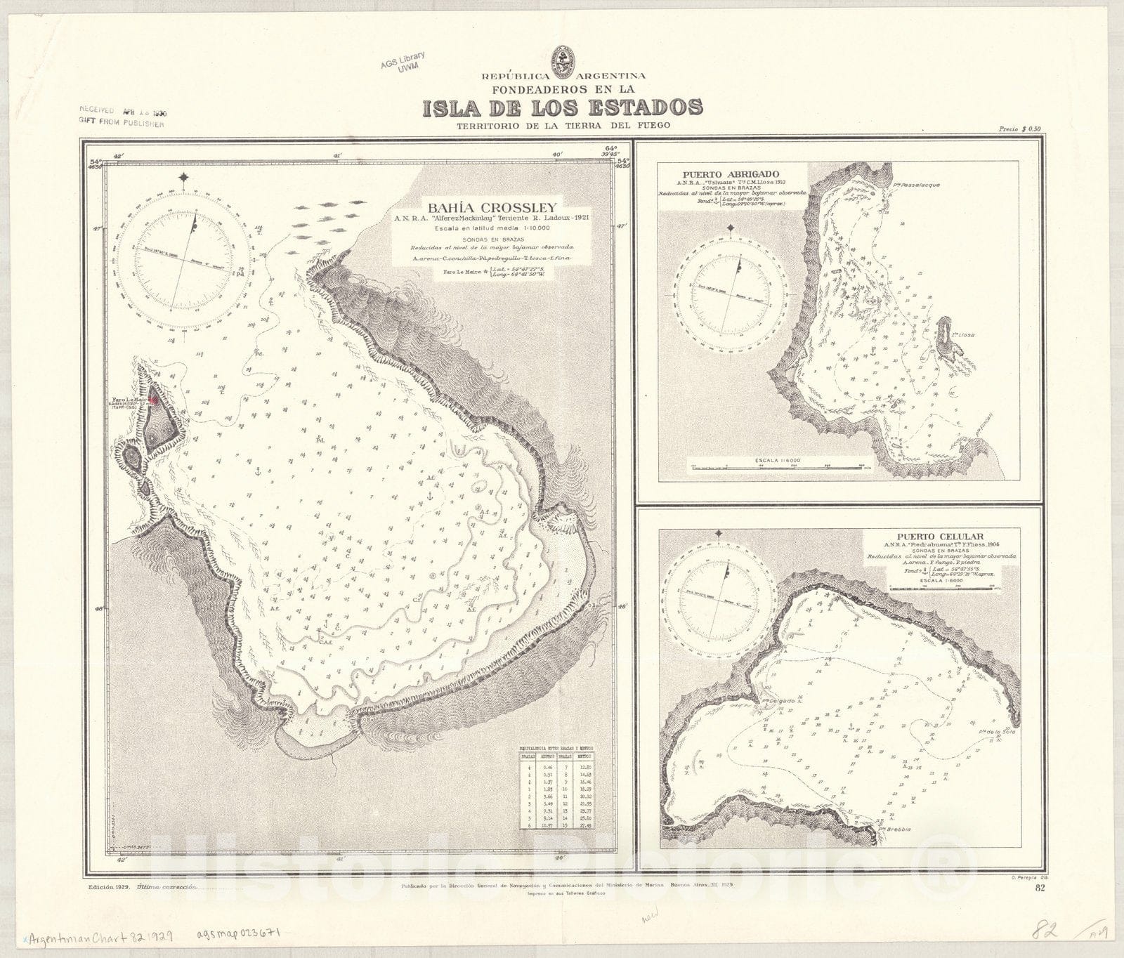 Map : Isla de los Estados, Argentina 1929, Republica Argentina, fondeaderos en la Isla de los Estados , Antique Vintage Reproduction