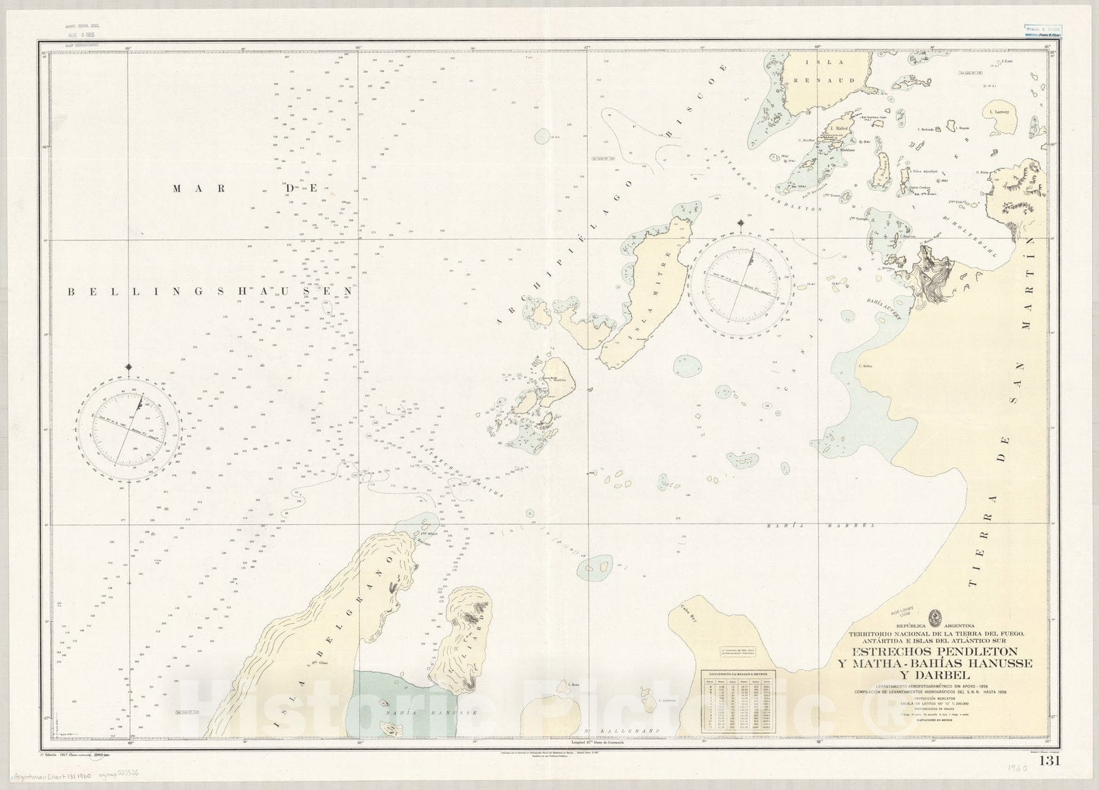 Republica Argentina, Territorio Nacional de la Tierra del Fuego, Antartida e Islas del Atlantico Sur, Estrechos Pendleton y Matha-Bahias Hanusse y Darbel / levantamiento aerofotogrametrico sin apoyo 1956 compilacion de levantamientos hidrograficos del