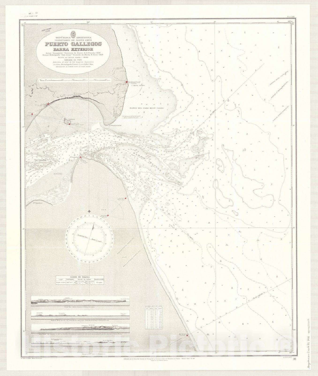 Map : Rio Gallegos, Argentina 1931, Republica Argentina, Territorio de Santa Cruz, Puerto Gallegos, barra exterior , Antique Vintage Reproduction