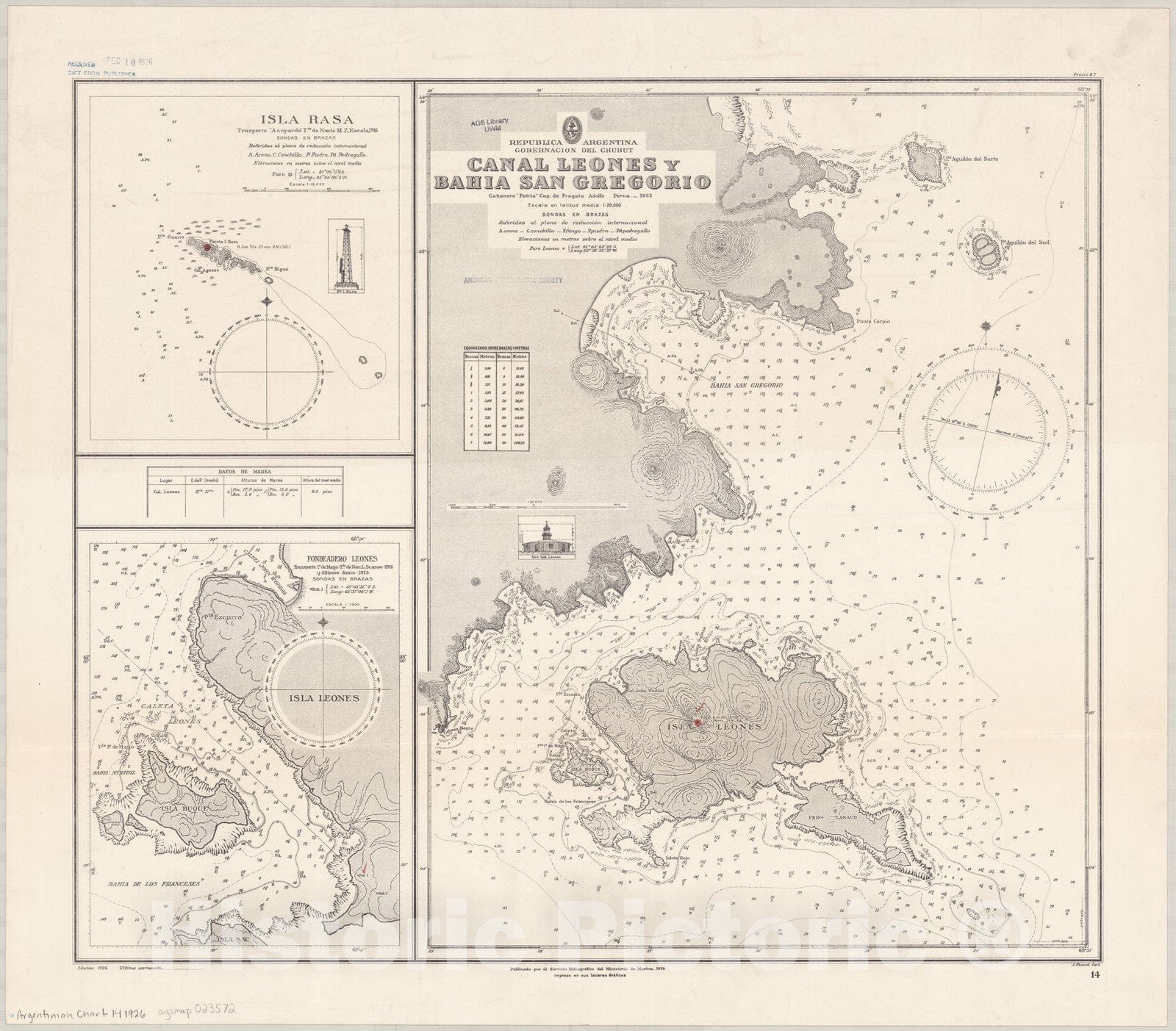 Republica Argentina, Gobernacio del Chubut, Canal Leones y Bahia San Gregorio / Canonero |"Patria|" Cap. de Fragata Adolfo Perna, 1925 ; publicado por el Servicio de Hidrografico del Ministerio de Marina