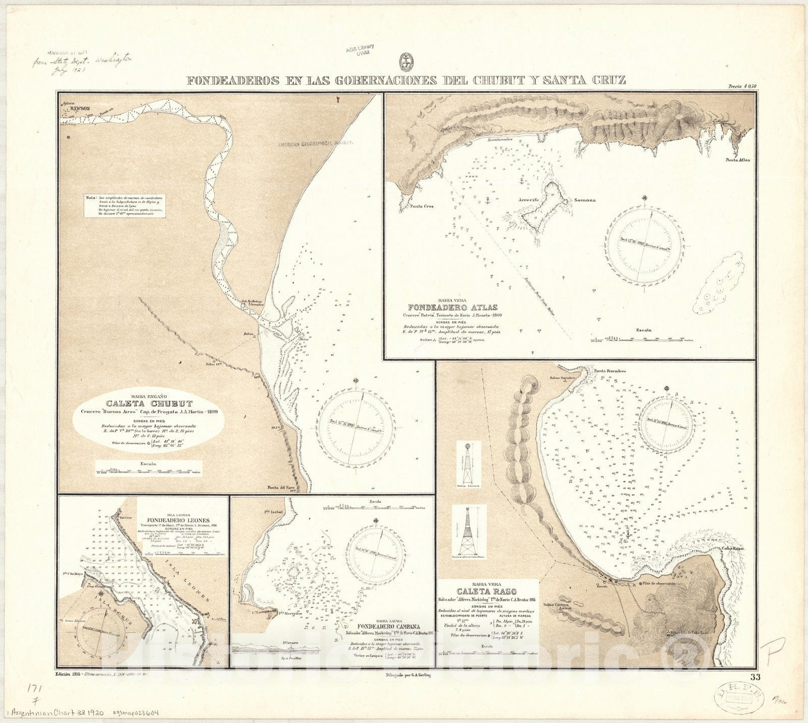 Map : Santa Cruz, Argentina 1920, Fondeaderos en las Gobernaciones del Chubut y Santa Cruz , Antique Vintage Reproduction