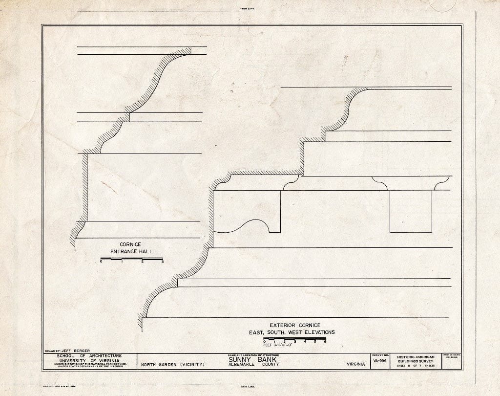 Blueprint Details, cornice in the entrance hall and exterior cornice on east, south and west elevations - Sunny Bank, State Route 712 vicinity, North Garden, Albemarle County, VA