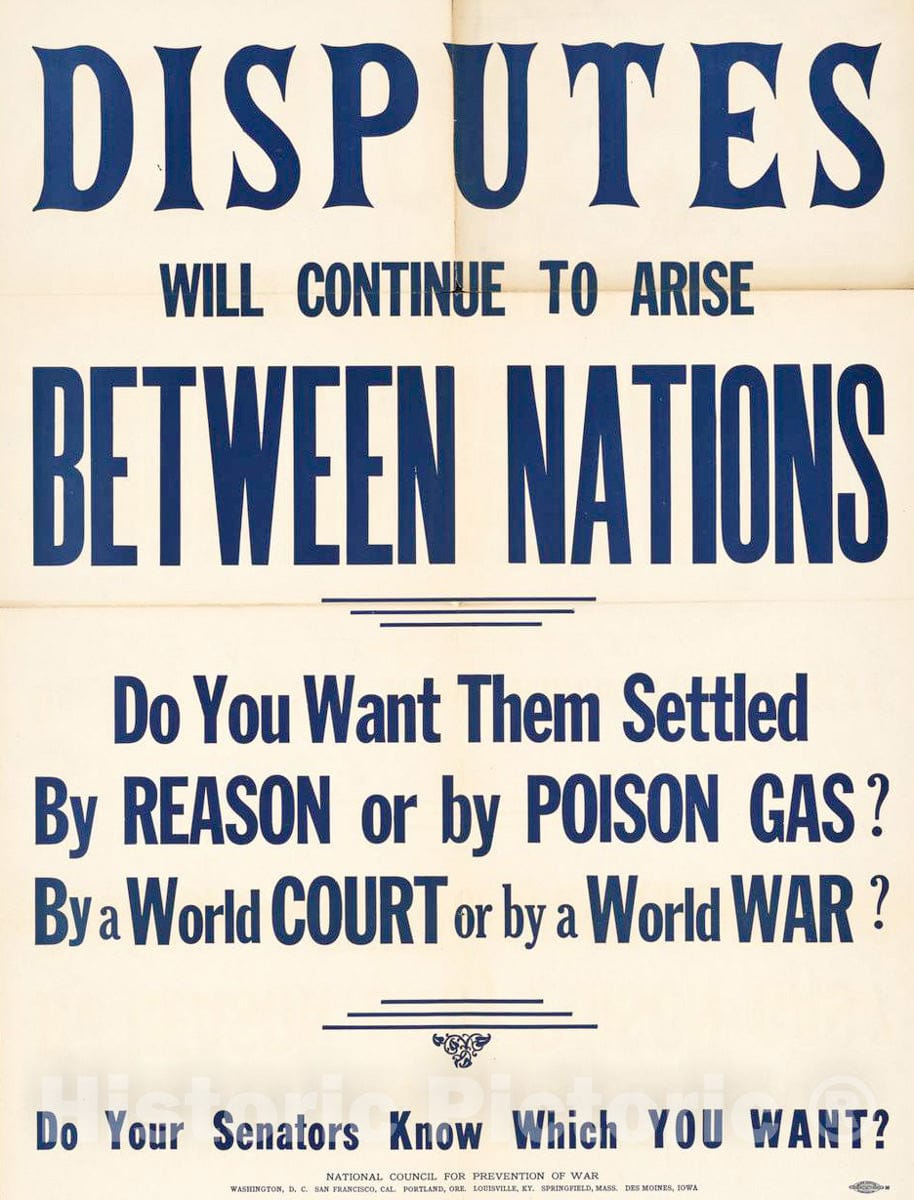• Vintage Poster -  Disputes Will Continue to Arise Between Nations. Do You Want Them Settled by Reason or Poison Gas?., Historic Wall Art