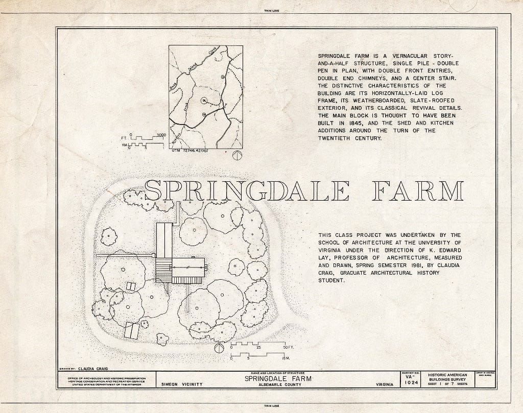 Blueprint HABS VA,2-SIM.V,1- (Sheet 1 of 7) - Springdale Farm, Buck Island Creek Vicinity, Simeon, Albemarle County, VA