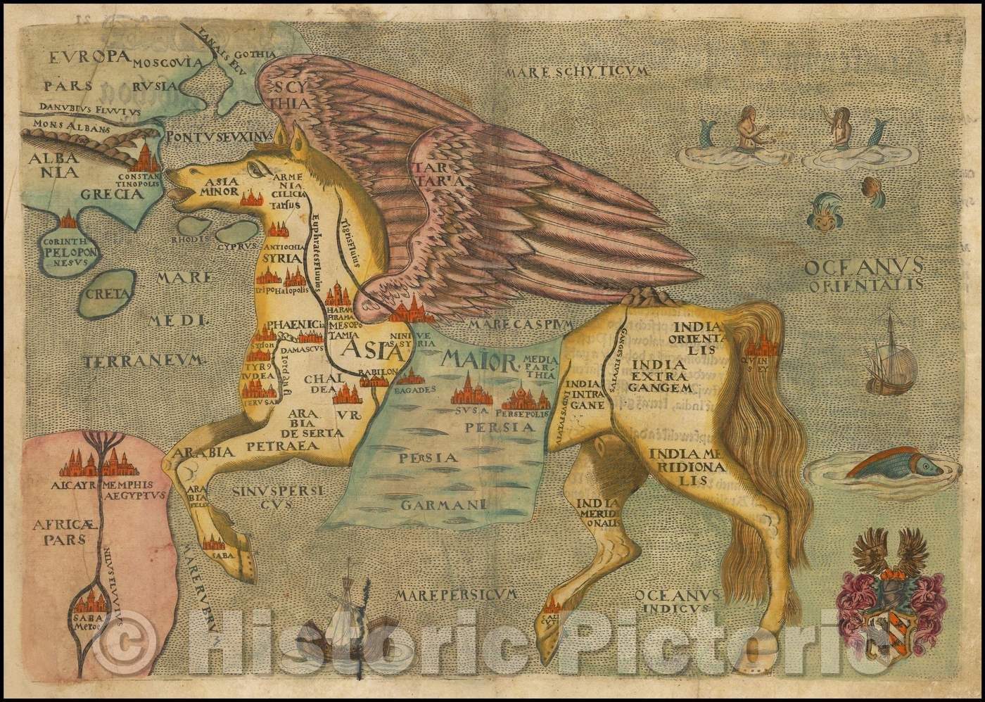 Historic Map - Asia in the Form of PegasusRare Czech Copperplate Edition!, 1592, Heinrich Bunting - Vintage Wall Art