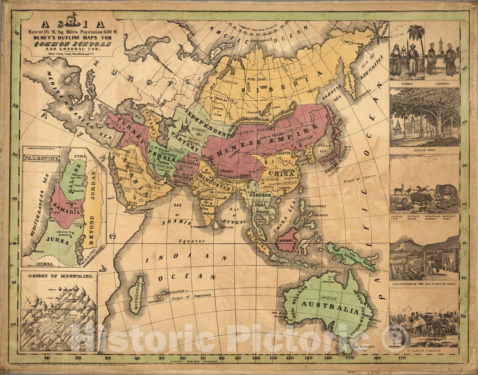 Olney's Outline Maps, for Common Schools and General Use. Asia ; Extent 16 M. Sq. Miles. Population 600 M. New York, Pratt, Woodford and Co. Entered according to Act of Congress in ... 1847, by Pratt Woodford ... Southern District of New York. (insets) Height of mountains ; and Palestine. | Olney's Outline Maps, for Common Schools and General Use. United States ; Ext.2,600,000 Sq. Miles. Population 20 Mil. New York, Pratt, Woodford and Co. Entered according to Act of Congress in ... 1847, by Pratt woodford ... Southern District of New York. | Four engraved maps. Hand colored, mounted on linen. Including: United States, Europe, Asia, and Africa. Each map shows administrative division, cities with population, etc. Includes population and square Milage. Maps of Asia and Africa include views of ethnic groups, plantations, and animals. Relief shown by hachures. Prime meridians: Washington and Greenwich.