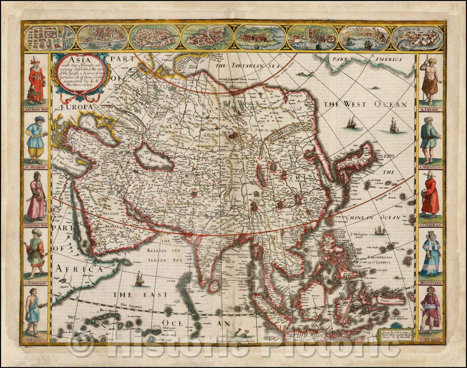 Historic Map - Asia with the Islands adjoining described, the attire of the people, Townes of importance, all of them newly augmented, 1626, John Speed - Vintage Wall Art